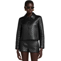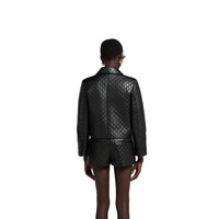 Sartorial silhouettes speak to the fine craftsmanship and sophisticated materials that have come to define Gucci's latest ready-to-wear. For Pre-Fall 2025 embossed leather pieces come to the forefront, such as this modern jacket with matching leather covered buttons. - Black embossed GG leather - Leather covered buttons - Matching lining - Point collar - Two side pockets - Button closure - Made in Italy