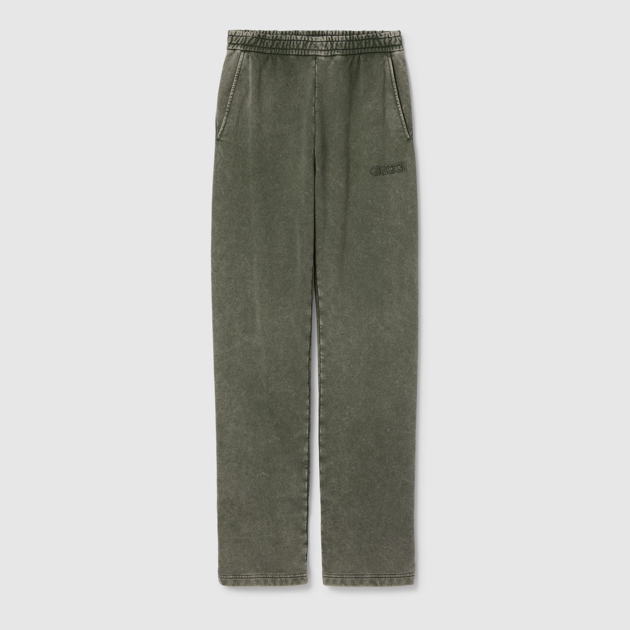 Gucci's House codes continue to evolve for the new season across relaxed jersey pieces. These relaxed jogging pants have been cut from a cotton jersey and defined by a Gucci embroidery. - Dark green cotton jersey - Gucci embroidery - Elastic waist with drawstring - Two front pockets - Length: 45.2"; based on a size S - Made in Italy - The product shown in this image is a size small
