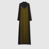 Crystal embellishments illuminate looks that transition effortlessly from day to night, revisiting signature motifs such as the GG pattern and Horsebit motif. Crafted from lightweight black silk georgette, this long dress is defined by an allover GG crystal embroidery. - Black light silk georgette - Allover GG crystal embroidery - Detachable slip dress lining - High neck - Long sleeves - Back button closure - Length: 62.9"