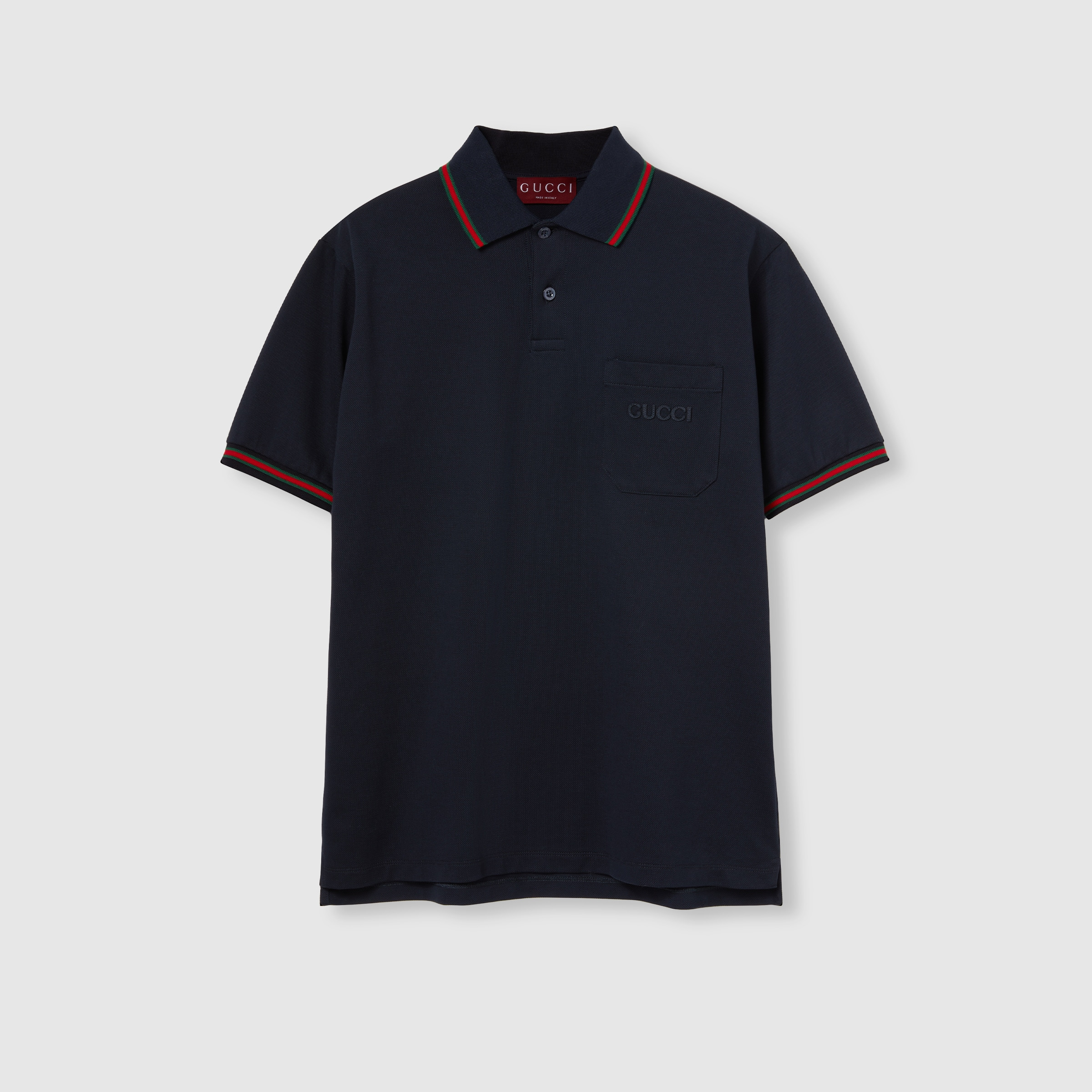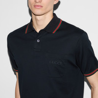 Classics such as soft knitwear and polo shirts throughout the Cruise 2025 collection stand out with subtle details that elevate everyday looks. This regular fit polo shirt is stated in a stretch cotton piquet and enriched with a Gucci embroidery and Web detail across the collar. - Dark blue stretch cotton piquet - Web trim - Gucci embroidery - Polo collar - Dropped shoulder - Short sleeves - Chest pocket - Rib trim - Shoulder drop: 18.1"; based on a size S - Chest: 21.6"; based on a size S - Sleeves length: 9.2"; based on a size S - Button closure - Regular fit - Length: 28.7"; based on a size S - Made in Italy - The product shown in this image is a size small
