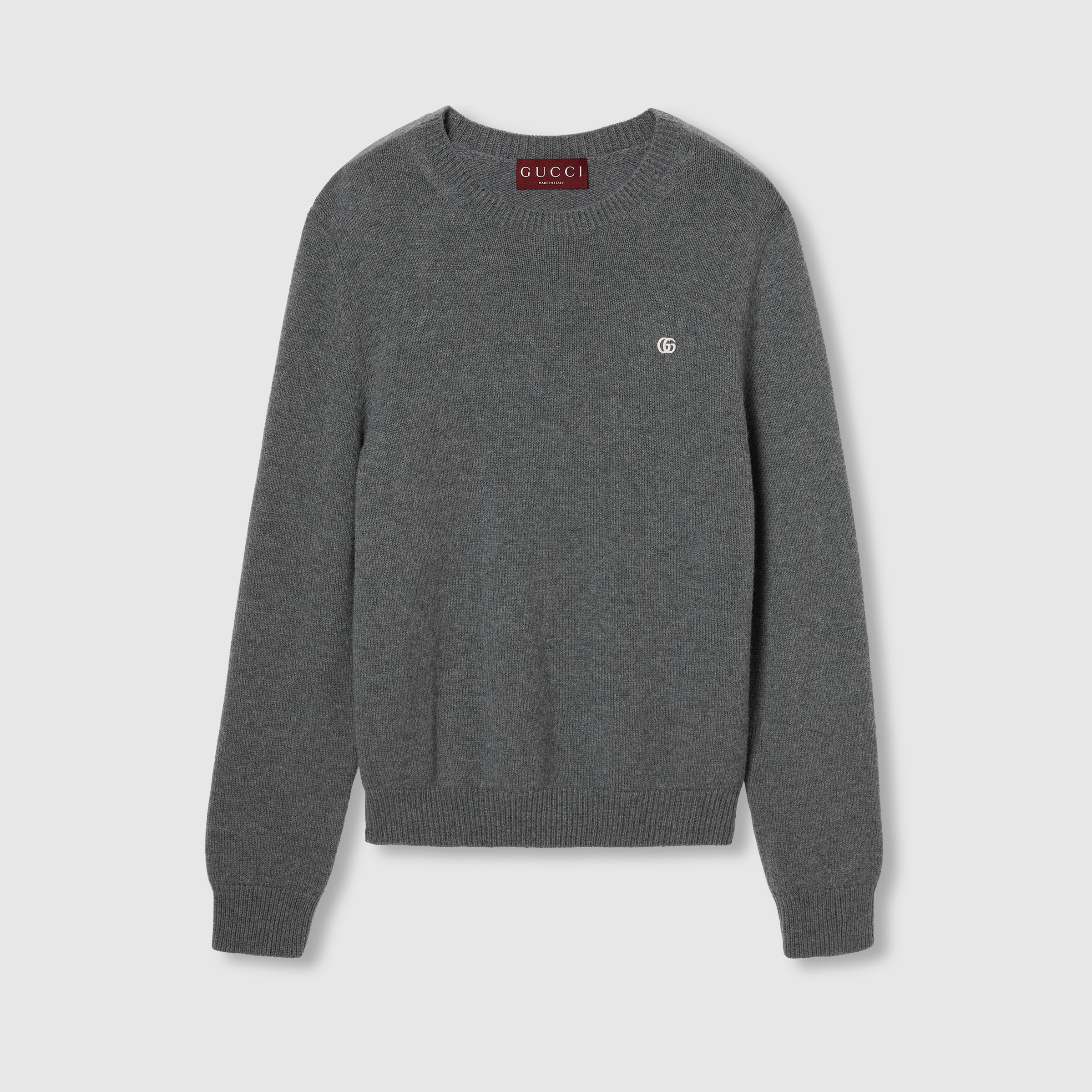 Classics such as soft knitwear and polo shirts throughout the Cruise 2025 collection stand out with subtle details that elevate everyday looks. This crewneck sweater has been made from a wool cashmere knit and enriched with a Double G embroidery. - Grey wool cashmere knit - Double G embroidery - Crewneck - Dropped shoulder - Long sleeves - Rib trim - Length: 25.5"; based on a size S - Made in Italy - The model is 6'2" and is wearing size small