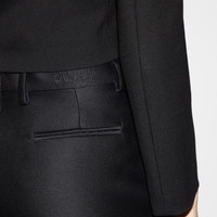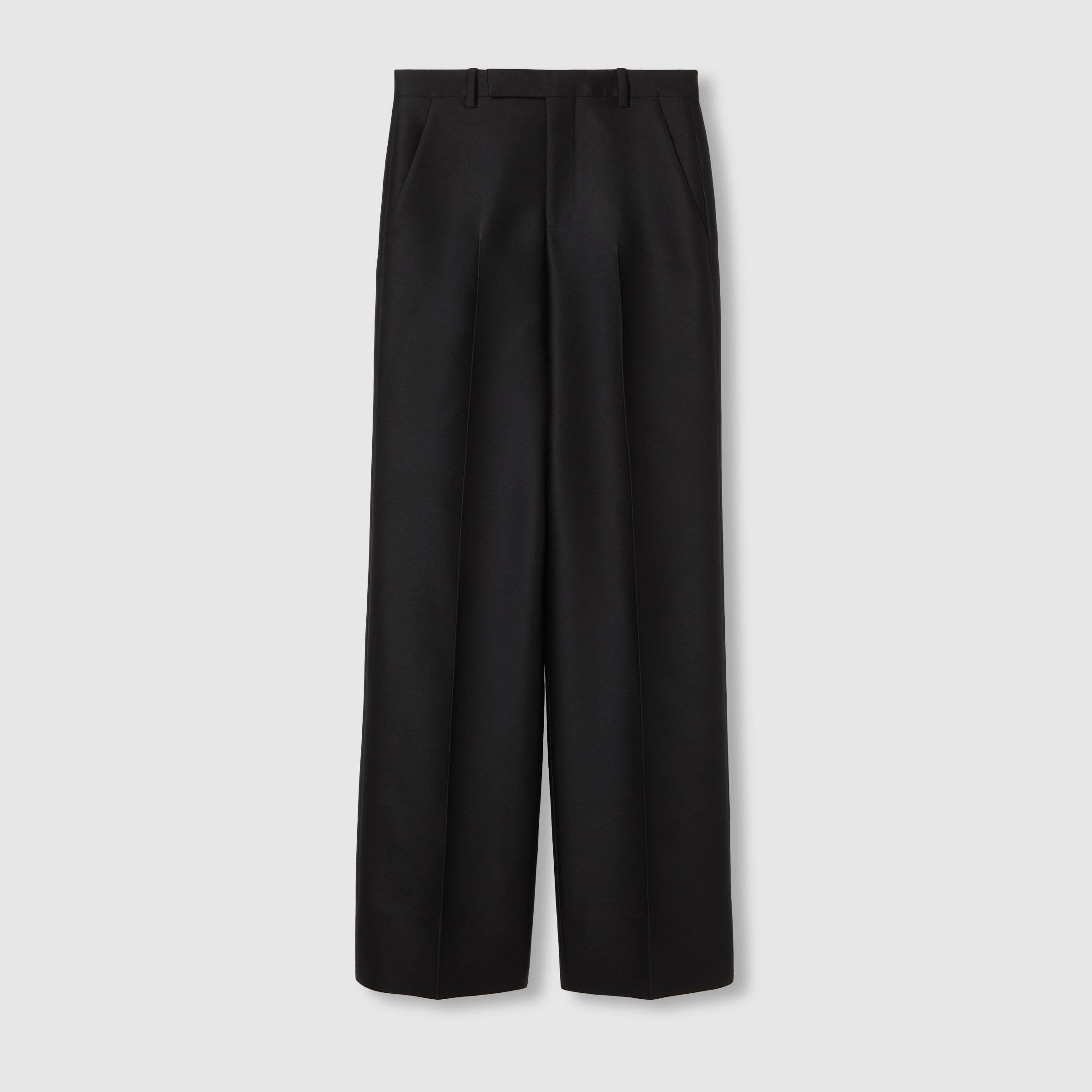 Classics such as elegant shirts and tailored jackets throughout the Cruise 2025 collection stand out with subtle details that elevate everyday looks. These pleated pants are presented in a wool silk gabardine and enriched with a tonal Gucci embroidery. - Black wool silk gabardine - Gucci embroidery - Unlined - Belt loops - Internal waistband - Two front pockets - Two back pockets - Pleats - Tab and zip fly closure - Wide leg - Made in Italy - The product shown in this image is a size 40 (IT)