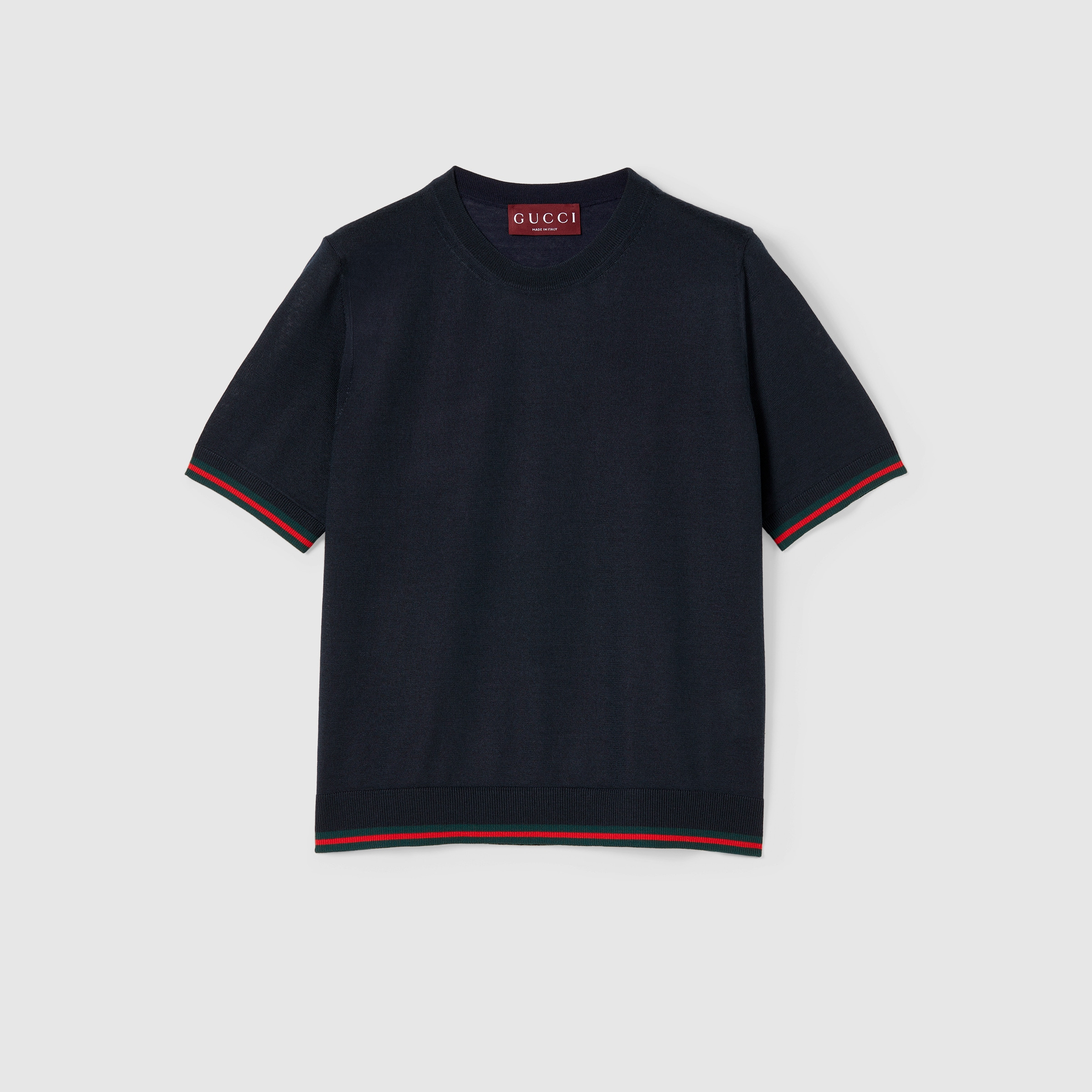 This crewneck top appears as part of the Cruise 2025 collection in an extra fine cashmere silk plain knit. A navy shade adds to the refined feel of the garment, further defined by a green and red Web trim. - Navy extra fine cashmere silk plain knit - Crewneck - Short sleeves - Web trim - Length: 20.9"; Shoulder: 13.8"; Half waist/chest: 18.1"; Sleeves length: 8.7" based on a size s - Made in Italy - The product shown in this image is a size small