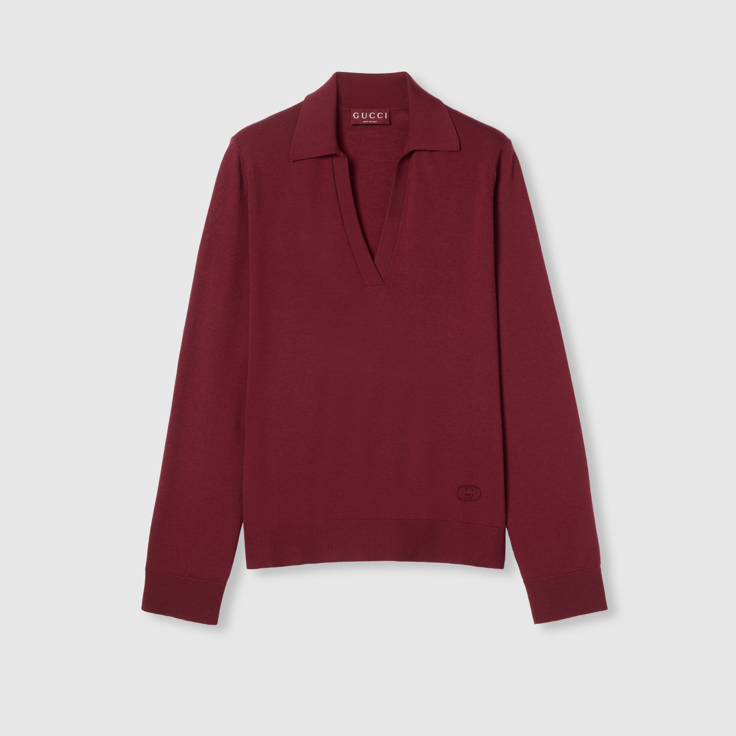 Refined shades of brown, grey, and red echo the hues of nature's changing landscape. Versatile and timeless, the color palette is easily interspersed within an everyday wardrobe. This oversized polo top has been crafted from an extra fine wool and is enriched with an Interlocking G embroidery. - Gucci Rosso Ancora red extra fine wool - Interlocking G embroidered detail - Polo collar - Long sleeves - Rib trim - Shoulder drop: 15.3 " based on a size M (IT) - Sleeves Length: 25.5 " based on a size M (IT) - Oversize fit - Length: 27.9 " based on a size M (IT) - Made in Italy