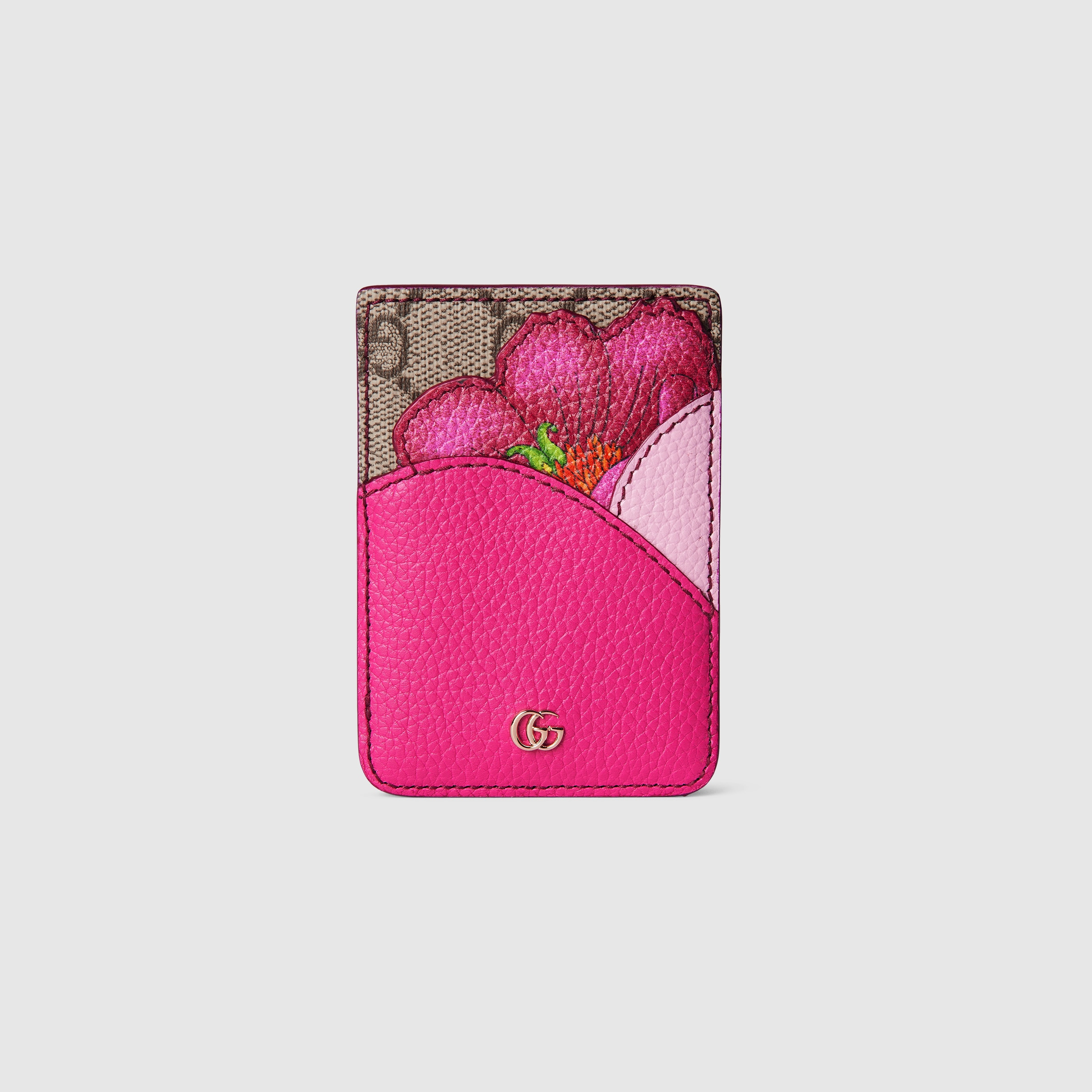 The Fall Winter 2025 collection introduces accessories that speak to the House's signature themes. This card case highlights the emblematic GG Supreme through new shapes and colours. - Fuchsia leather - Beige and dark brown GG Supreme - Light gold-toned hardware - Flower detail - Double G - Inside: one slot under the flower - 2.5"W x 3.7"H - Made in Italy