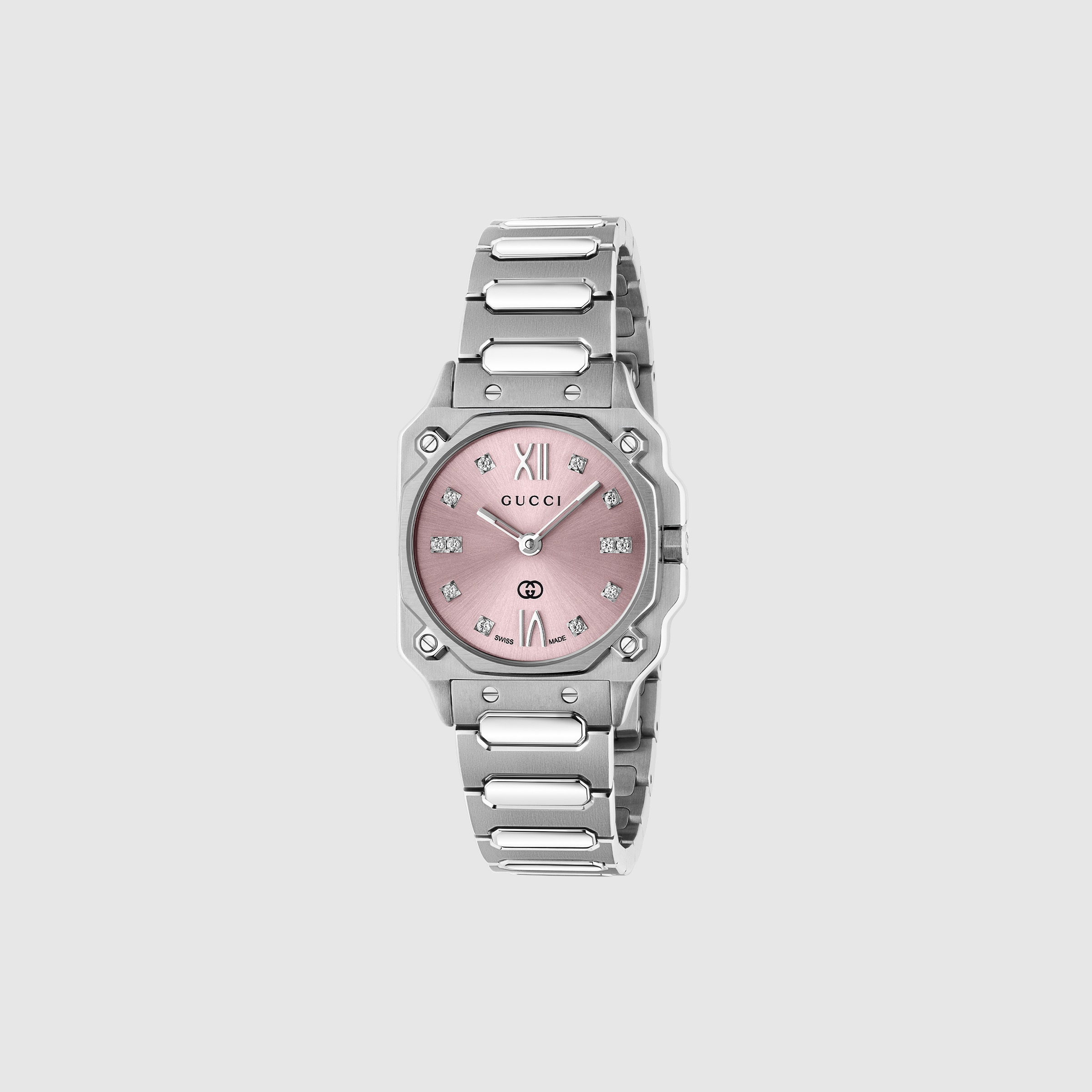 First introduced in the 1970s, the G-Flat watch pays homage to the heritage designs of the House with a modern touch. Characterized by octagonal angles and a multi-layered profile, the watch evokes the architectural landscape of the 1970s. This watch appears in stainless steel with pink galvanized dial and diamond indexes. - 24 mm stainless steel case - Pink galvanized dial with roman indexes at 12 and 6 o’clock and diamond indexes - Sapphire glass with antireflective coating - Stainless steel bracelet - The warranty certificates for Gucci watches purchased after March 1st 2022 are exclusively available online. - Download your certificate at - by using the serial number engraved on the back of your watch. - Quartz movement - 5 ATM (50 meters/164 feet) - YA166501 - Wrist size from 4.7" to 6.9"