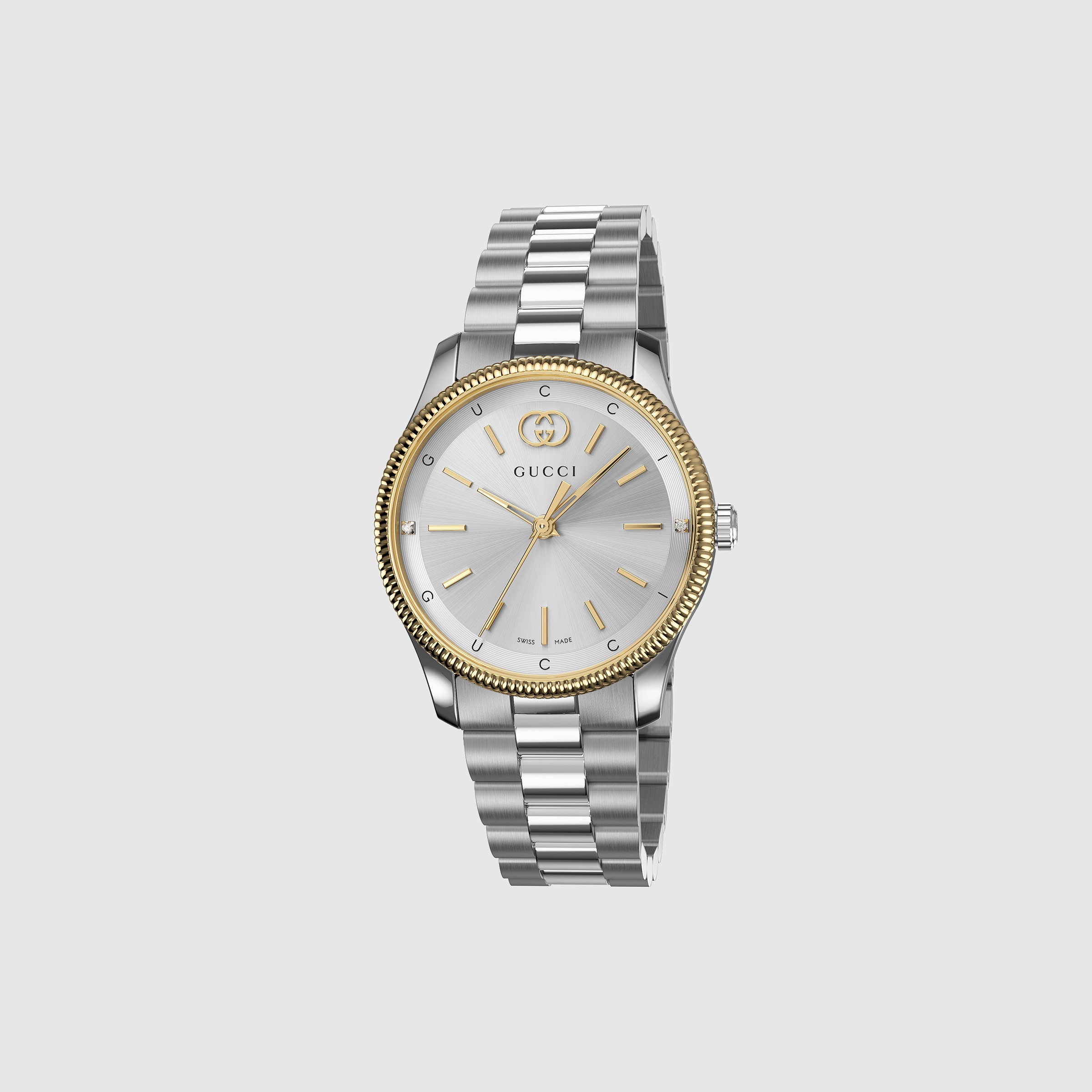 The season's polished look extends to watches and jewelry, including the G-Timeless collection. The round watch spotlights a sleek dial finish with subtle expressions of the Interlocking G and the Gucci lettering. Designed with a silver dial, the accessory is further enriched with signature motifs of the House. - 29 mm stainless steel case with gold-plated bezel, silver dial with diamonds and Interlocking G and Gucci lettering, stainless steel bracelet - Sapphire glass with anti-reflecting coating - The warranty certificates for Gucci watches purchased after March 1st 2022 are exclusively available online. - Download your certificate at - by using the serial number engraved on the back of your watch. - 5 ATM (50 meters/164 feet) - Quartz movement - Wrist size from 4.7" to 7.7" - YA1265063 - Swiss Made - This item is available for pre-launch until March 1.