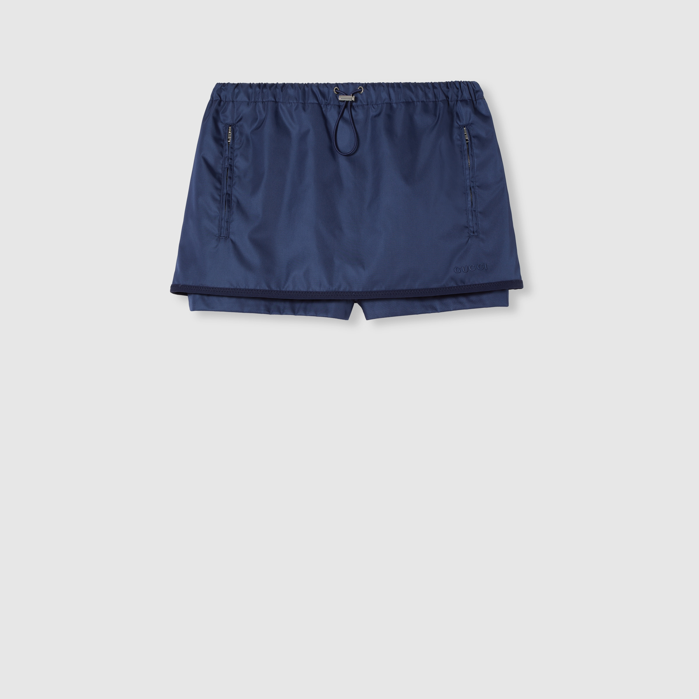 Essential everyday pieces blend sophistication and functional materials with a refined touch for the Pre-Fall 2025 collection. This skort in gabardine fine nylon features a subtle Gucci metal detail. - Blue gabardine fine nylon - Gucci metal detail - Unlined - Elastic waist with drawstring - Two side zip pockets - Shorts underneath - Made in Italy