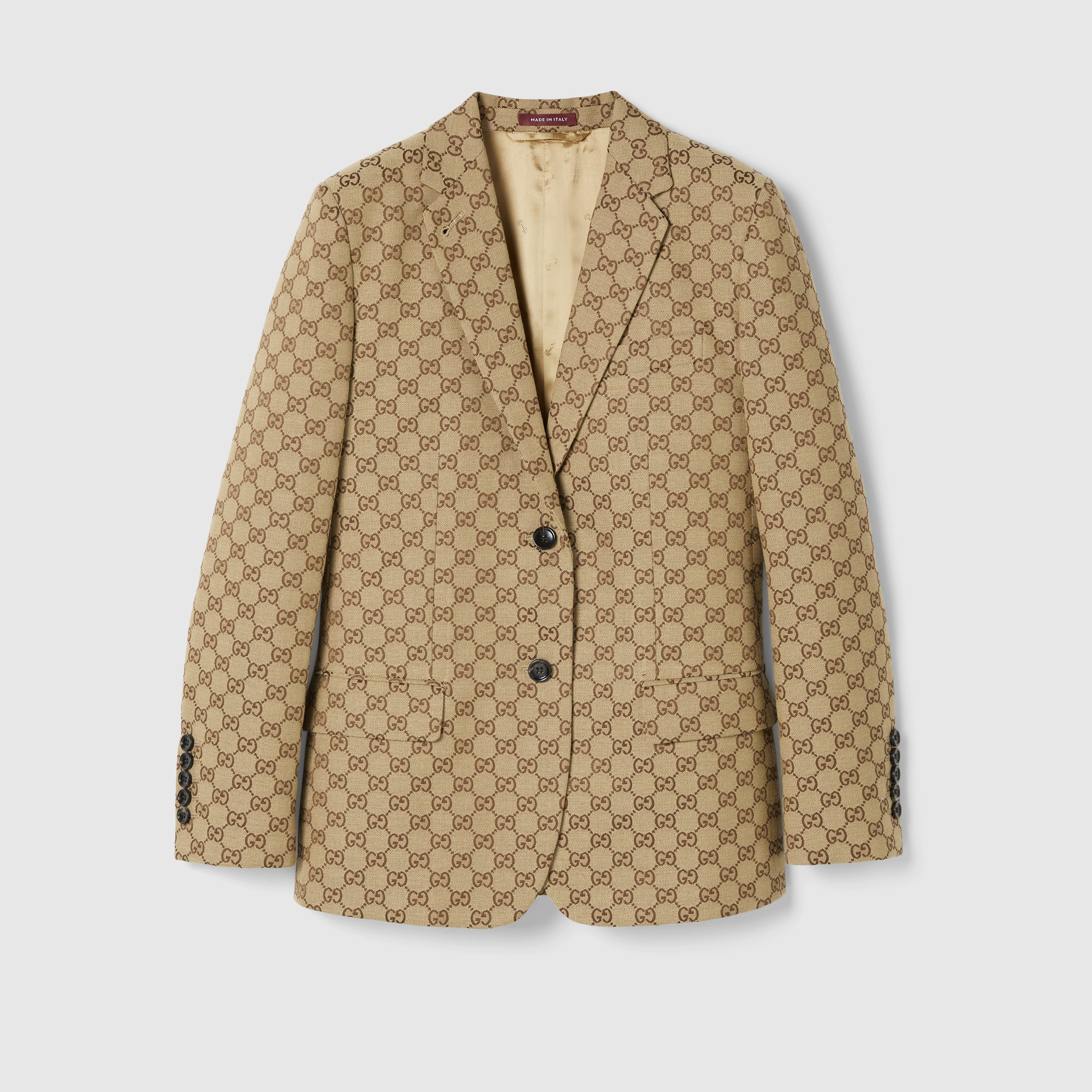 Inspired by the summer spirit and beach clubs on the Italian coast, this item is part of Gucci Lido. Emblematic codes of the House and refined patterns are reinterpreted in contemporary ways for the Pre-Fall collection. This tailored jacket is presented in camel and ebony Original GG canvas, making for a striking seasonal addition to your wardrobe. - Camel and ebony Original GG canvas - Half lined - Full canvas construction - Single breasted - Notch lapel - One breast pocket - Two flap pockets - Inside pocket - Button closure - Length: 27.1", based on a size 40 (IT) - Shoulders: 15.7"; Sleeve length: 31.5" - Made in Italy - The product shown in the image is a size 40 (IT)