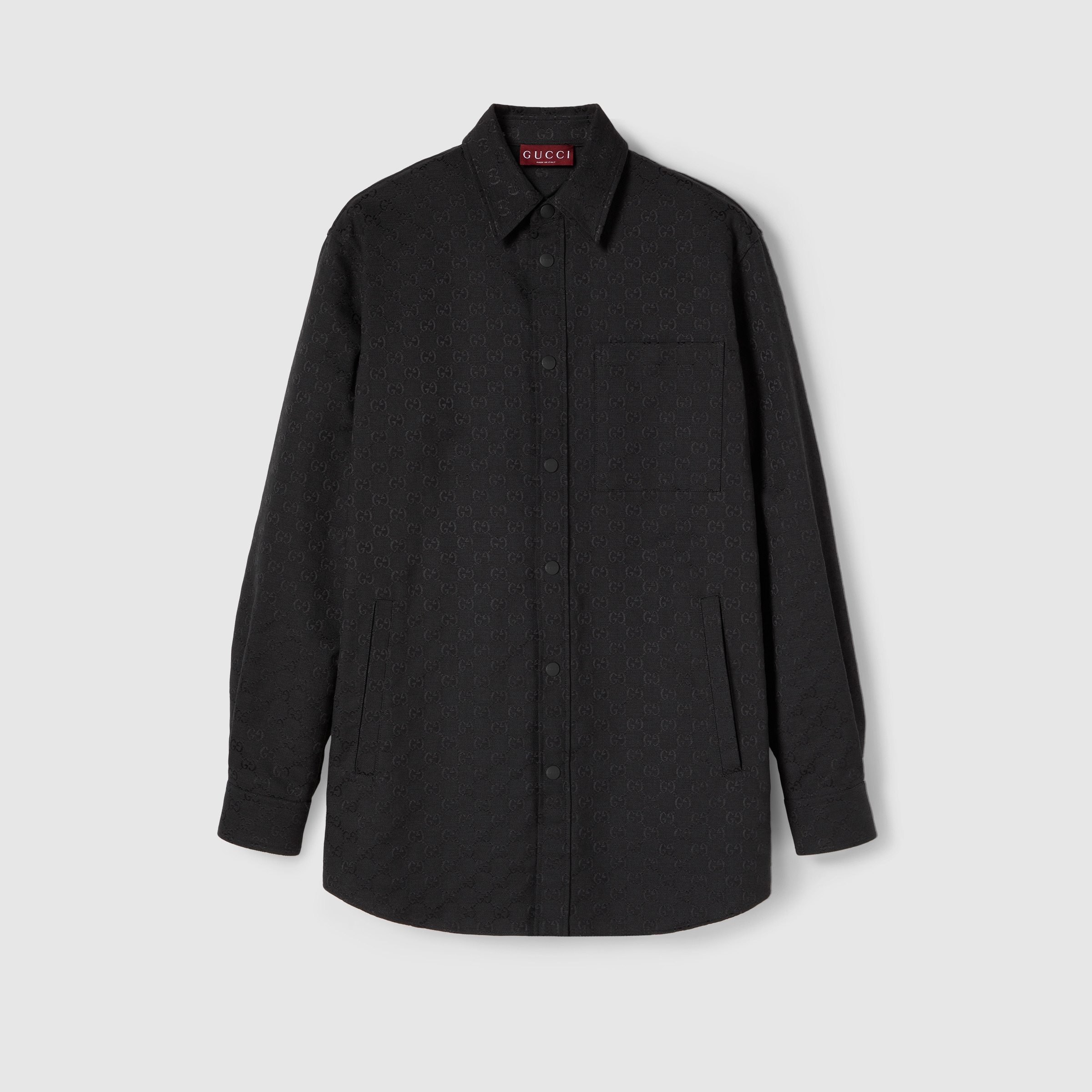 The House reinvents the essential men's wardrobe for the Pre-Fall 2024 collection, with wearabilty and fit becoming key statements. Here, this shirt is crafted from sophisticated black GG canvas. Its oversize fit and tonal snap button closure put a contemporary twist on the classic piece. - Black GG canvas - Point collar - Long sleeves - Front patch pocket - Neck width: 17.3"; based on a size 50 (IT) - Shoulder drop: 20.4"; based on a size 50 (IT) - Chest: 50.7"; based on a size 50 (IT) - Sleeves length: 50.7"; based on a size 50 (IT) - Snap button closure - Oversize fit - Length: 32.6"; based on a size 50 (IT) - Made in Italy - The model is 6'1" and is wearing size 50 (IT)