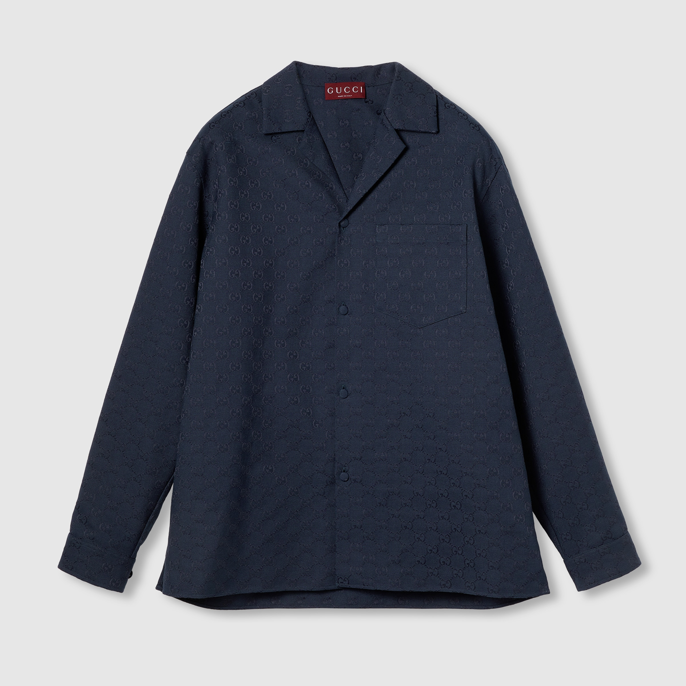 Taking inspiration from founder Guccio Gucci's monogram, the GG motif continues to be a firm favorite of the House. This regular fit shirt has been crafted from a GG canvas and has two side slits. - Dark blue GG canvas - Open collar - Long sleeves - Chest pocket - Side slits - Shoulder drop: 20"; based on a size 48 - Chest: 46.8"; based on a size 48 - Sleeve length: 35"; based on a size 48 - Button closure - Regular fit - Length: 29.5"; based on a size 48 - Made in Italy - The product shown in the image is a size 48 (IT)