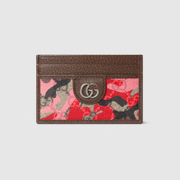 Vibrant camouflage in distinctive colors reinterprets the emblematic GG motif. Crafted from a marbled GG Monogram coated fabric, this card case features a Double G detail. - Pink and red camouflage marbled GG Monogram coated fabric - Brown leather trim - Palladium-toned hardware - Brown taffeta lining - Double G - Web detail - Inside: 1 open compartment - Outside: 4 card slots - 4.3"W x 2.7"H - Weight: 11.8", approximately - Made in Italy
