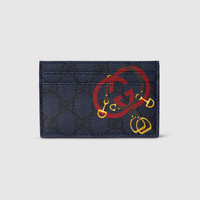 An Interlocking G with stirrup print embellishes small leathergoods for a festive touch. Here it appears across a card case crafted from soft GG Supreme. - Dark blue and multicolor soft GG Supreme - Interlocking G stirrup print - Taffeta lining - Inside: 1 Open Compartment, 4 card slots - 4.3"W x 2.75"H