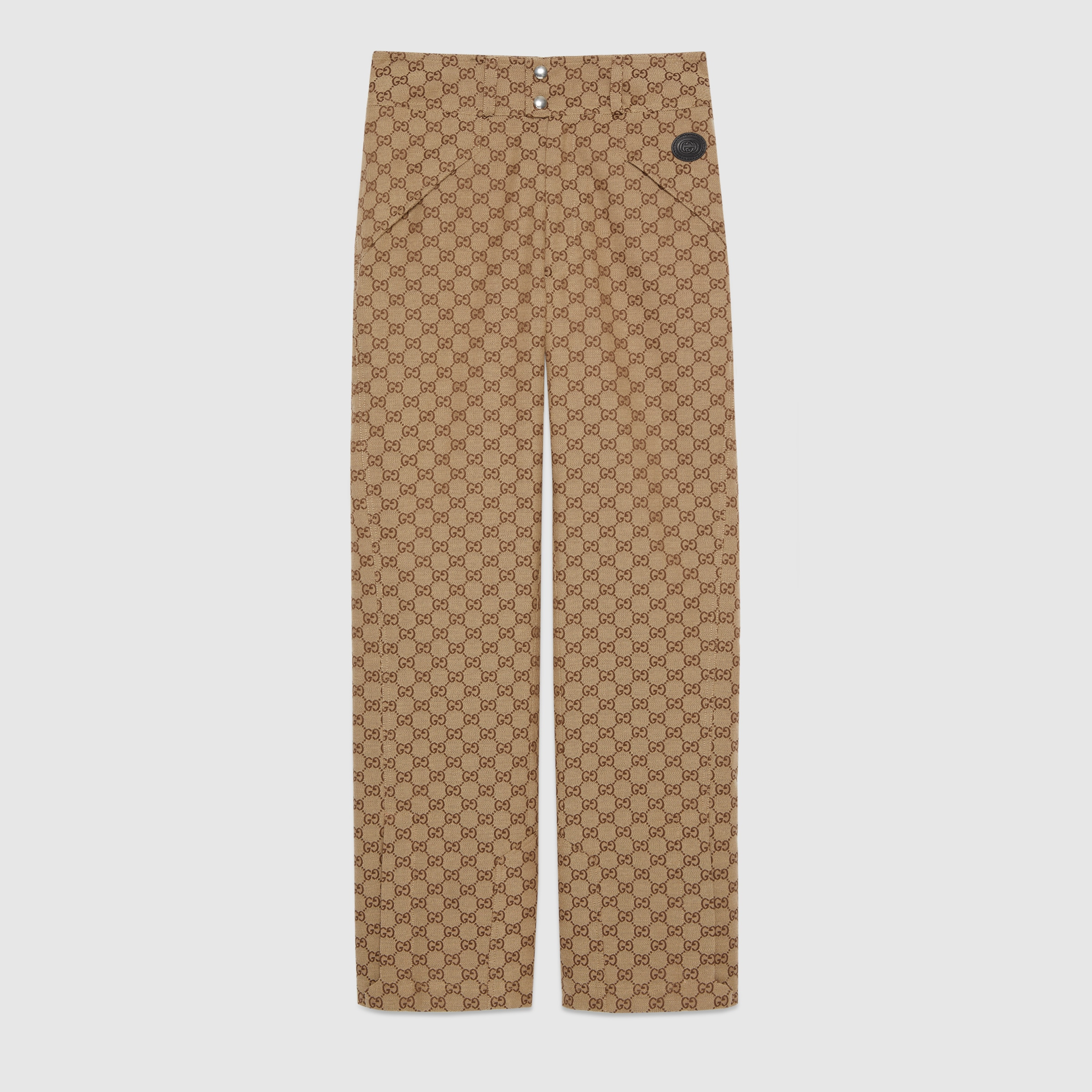 Paying tribute to both the past and present, this camel and brown pant is crafted from GG cotton canvas, a historic interpretation of the House's logo. An oval leather tag with the Interlocking G completes the design with a retro feel. - Camel and brown GG cotton canvas - Lined - Belt loops - Oval leather tag with Interlocking G - Two side pockets - Two back pockets - Button and zip closure - Length: 42.5" based on a size 40 (IT) - Leg opening: 18.9" based on a size 40 (IT) - Made in Italy - The model is 5'7" and is wearing size 40 (IT)