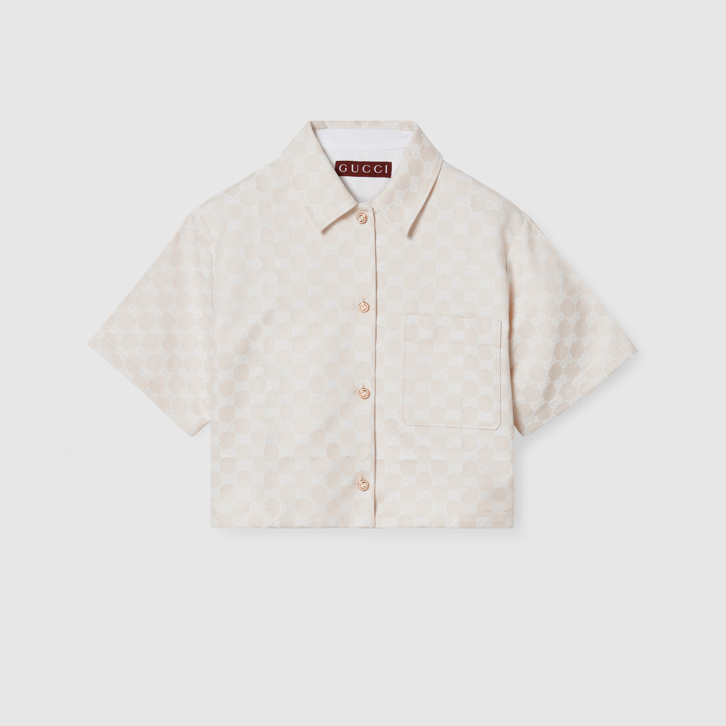 Inspired by the summer spirit and beach clubs on the Italian coast, this item is part of Gucci Lido. Emblematic codes of the House and refined patterns are reinterpreted in contemporary ways for the Pre-Fall collection. This short-sleeved shirt is presented in light beige GG cotton gabardine, making for a striking seasonal addition to your wardrobe. - Light beige GG cotton gabardine - Round Interlocking G enameled buttons - Point collar - Short sleeves - Breast pocket - Front button closure - Length: 19.3" based on a size 40 (IT) - Made in Italy - The product shown in this image is a size 40 (IT)