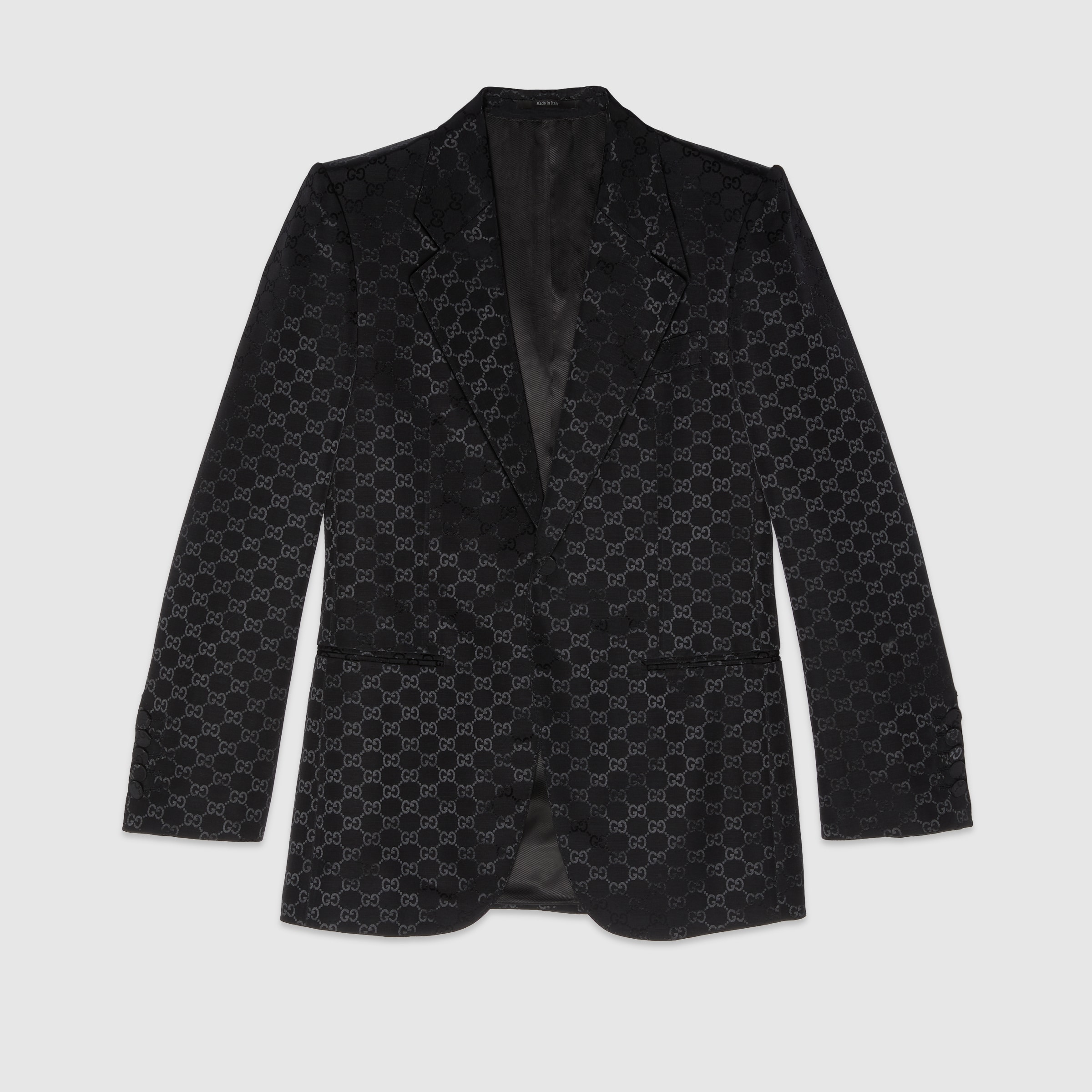 Gucci Love Parade continues the narrative that speaks to both the traditional and the contemporary nature of the House. Symbols that have defined different eras appear as recognizable logos and through subtle hints to the past. Presented in black, this single-breasted jacket is crafted from light GG canvas. - GG black cotton viscose - Fully lined - Single breasted - Notch lapel - Full canvas construction - Buttoned cuffs - Front button closure - Length: 30" based on a size 46 (IT) - Made in Italy - The product shown in this image is a size 46 (IT)