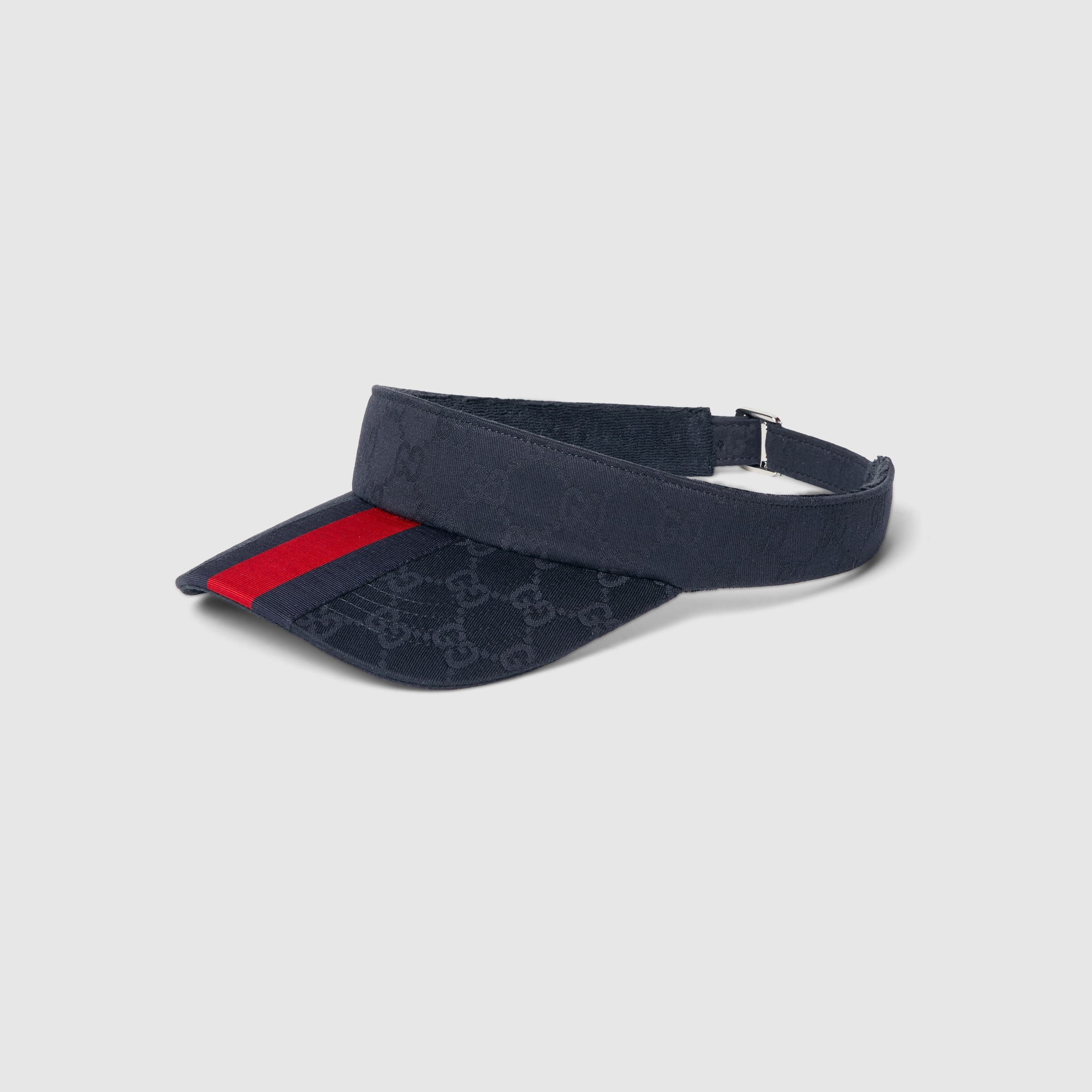 The GG cotton gabardine enriches Gucci Tennis pieces in a new shade of dark blue. This structured visor is enhanced with a green and red Web stripe. - Dark blue GG cotton gabardine - Dark blue terry cloth trim - Web stripe - Adjustable back closure - Made in Italy