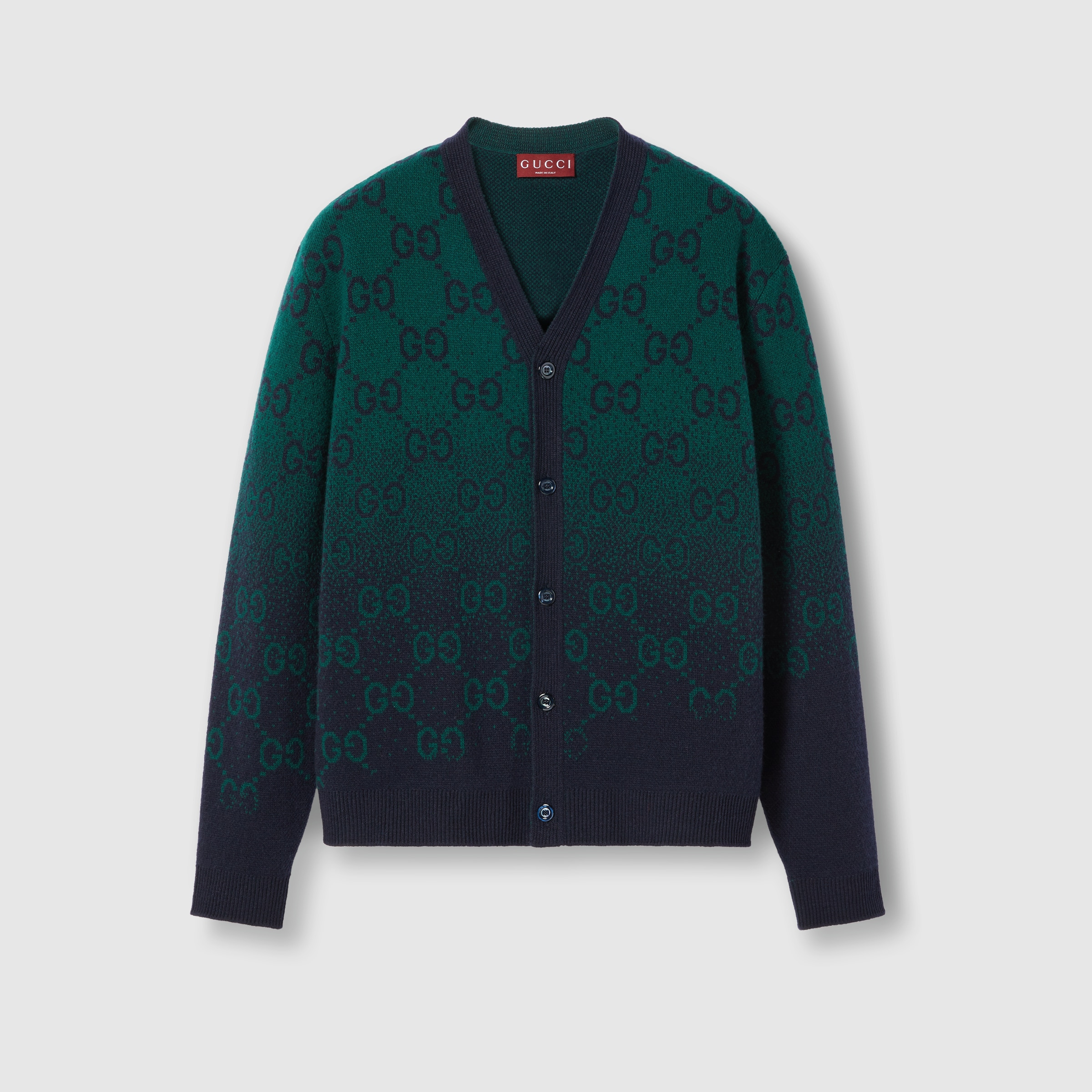 The GG motif appears in unexpected colors and fabric combinations, from linen blend to nylon. This regular fit cardigan is presented in a GG degrade wool jacquard, paying homage to Guccio Gucci's instantly-recognizable monogram motif. - Dark green GG degrade wool jacquard - V-neck - Dropped shoulder - Rib trim - Shoulder drop: 18.1"; based on a size S - Chest: 21.6"; based on a size S - Sleeves length: 24.8"; based on a size S - Button closure - Regular fit - Length: 25.9"; based on a size S - Made in Italy - The product shown in the image is a size small