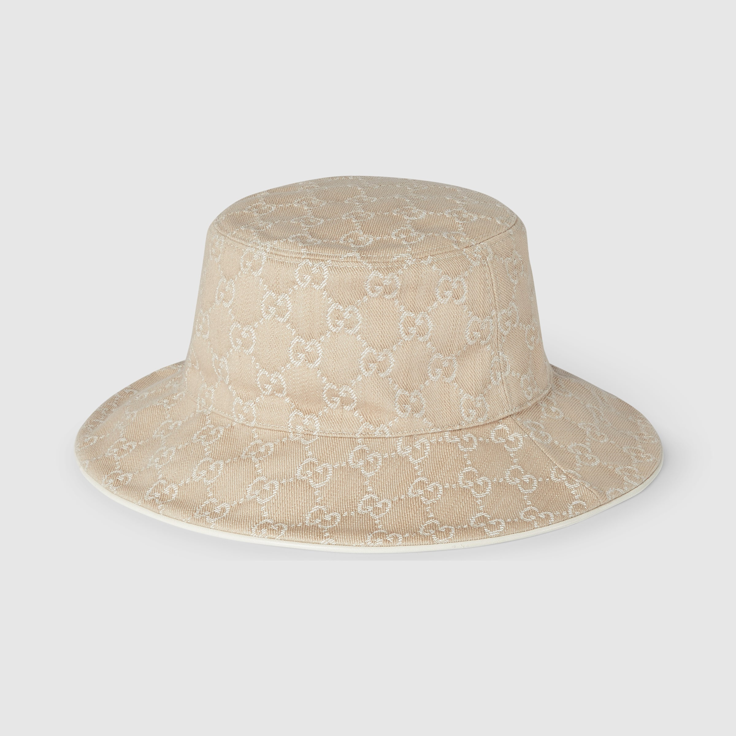 The Pre-Fall 2025 collection explores the GG denim fabric, reinterpreting it with washing techniques, contrasting hues and trompe-l'oeil prints across silk and soft accessories. This bucket hat has been crafted from a GG denim and defined by a Horsebit detail. - Light grey and white GG denim - Cotton linen lining - Horsebit - Made in Italy