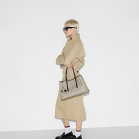 The new GG Emblem collection reinterprets the House’s history of elegance and craftsmanship. This medium tote bag features numbered notches on the adjustable top handles, inspired by the equestrian world. - Beige and dark brown new GG Monogram coated fabric - Black leather trim with contrast stitching - Green and red Web cotton lining - Additional D-ring for detachable items - Numbered notches on the adjustable handles; drop: 8.5" - 12.4" - Inside: 2 compartments and 1 zip central compartment - Magnetic snap closure - Medium: 15"W x 9.8"H x 5.9"D - Weight: 1.9lbs, approximately - Made in Italy - Fits iPhone Pro Max/Plus, Airpods, long wallet, and lipstick