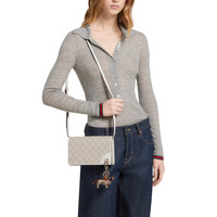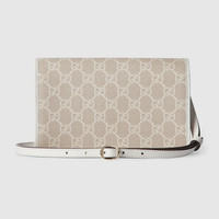 The GG Emblem collection reinterprets signature motifs through creativity and innovative functions, and is envisioned to be cherished for years to come. Introduced in the latest line of small accessories, this beige and white shoulder bag is crafted from the new GG Monogram fabric. Featuring an off white leather trim, the design comes with an embossed Gucci logo. - Beige and white new GG Monogram coated fabric - Off white leather trim - Web taffeta lining - Embossed Gucci - Additional D-ring for detachable items - Contrast stitching - Inside: 1 zip pocket, card slots with flat pocket - Adjustable shoulder strap with 20.5" drop - Snap button closure - Super mini: 8"W x 5"H x 2"D - Weight: 0.71lbs approximately - Made in Italy