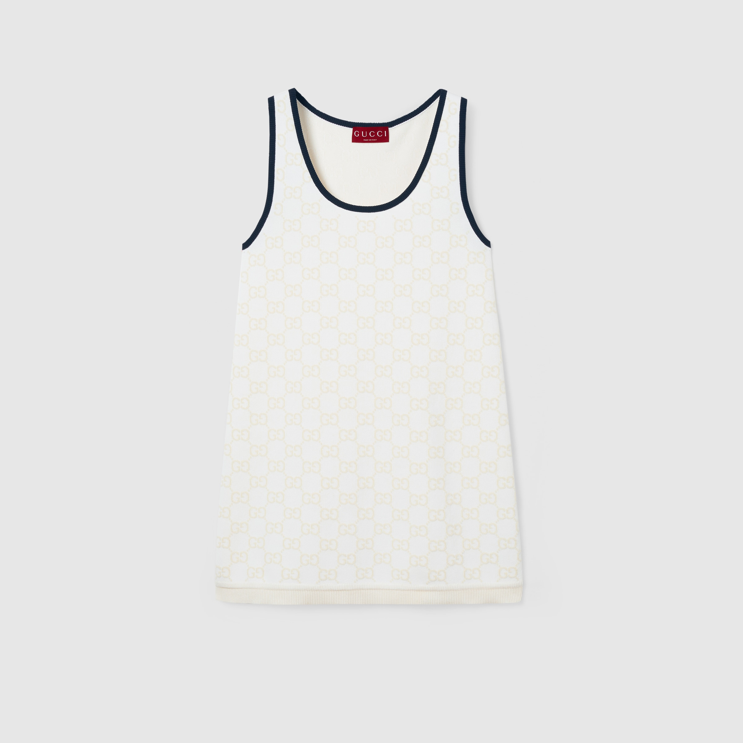The Pre-Fall 2025 collection perfectly blends versatile textures and sophisticated detailing. GG jacquard weavings and intricate details evolve to reflect the changing seasons. The allover GG motif defines this dress, while a contrasting navy trim creates a refined finish. - White GG fine cotton jacquard - Navy trim - Scoop neck - Sleeveless - Made in Italy