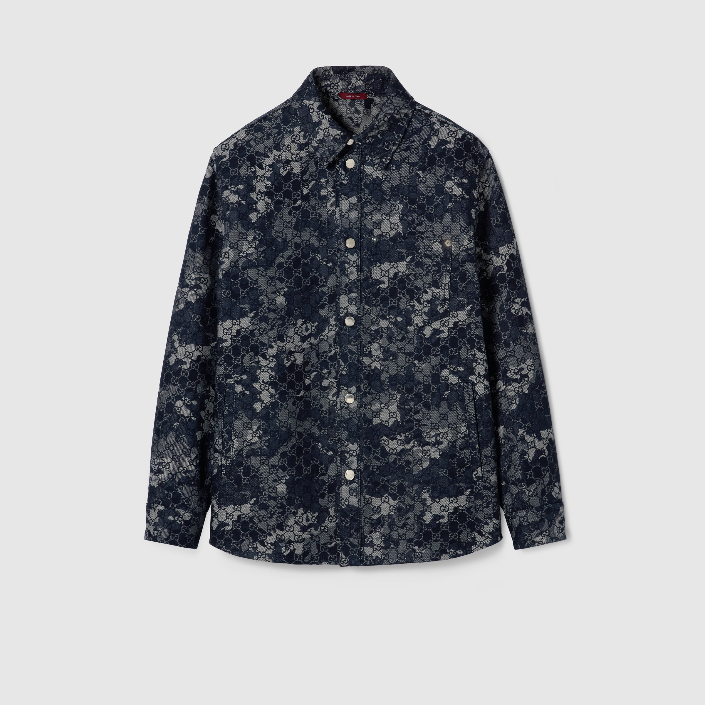 For the Pre-Fall 2025 collection, denim pieces with intricate details elevate everyday looks. Crafted from dark blue and ivory GG marbled effect denim jacquard, this shirt is finished with Gucci metal buttons. - Dark blue and ivory GG marbled effect denim jacquard - Gucci metal buttons - Point collar - Chest pocket - Long sleeves - Front button closure - Made in Italy