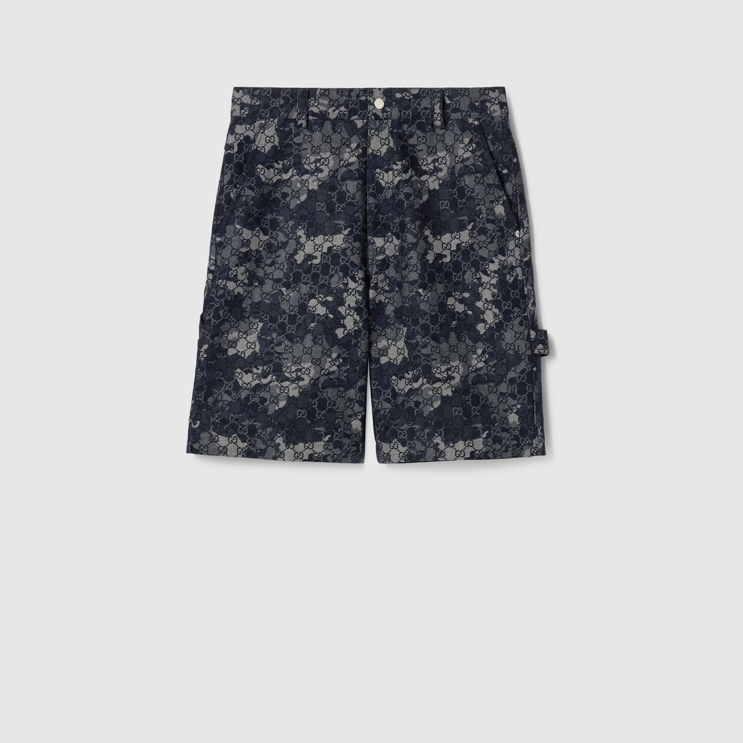 For the Pre-Fall 2025 collection, denim pieces with intricate details elevate everyday looks. Crafted from dark blue and ivory GG marbled effect denim jacquard, this pair of shorts is finished with a naplak label. - Dark blue and ivory GG marbled effect denim jacquard - Dark blue naplak label - Belt loops - Side carpenter pocket and loop - Front and back pockets - Button and zip closure - Made in Italy