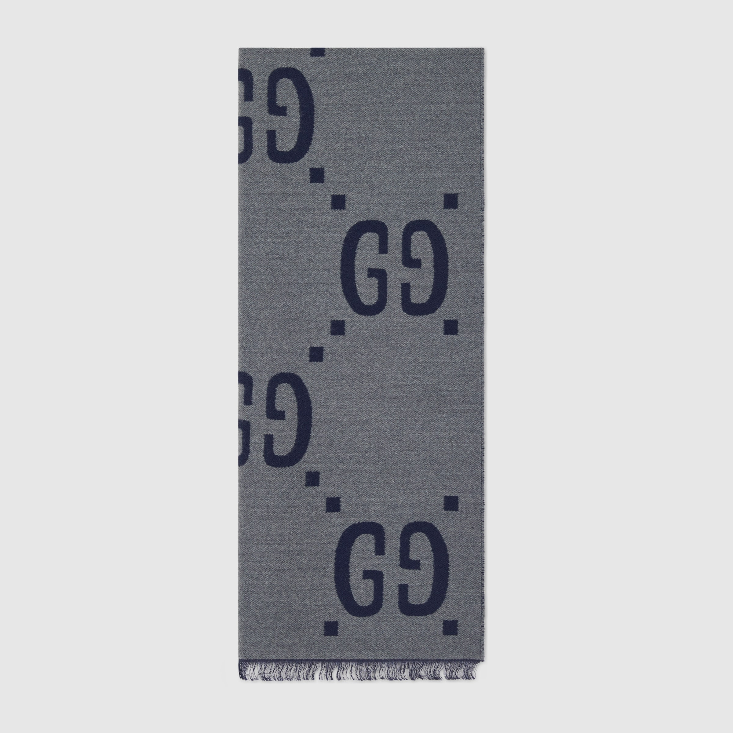 The House's most emblematic codes elevate everyday accessories. Presented in a contrasting color combination of light grey and dark blue, the typographic GG motif alternates across this soft wool silk jacquard scarf. - Light grey and dark blue GG jacquard wool silk - Fringe trim - 13.8"W x 74.8"L - Made in Italy