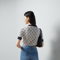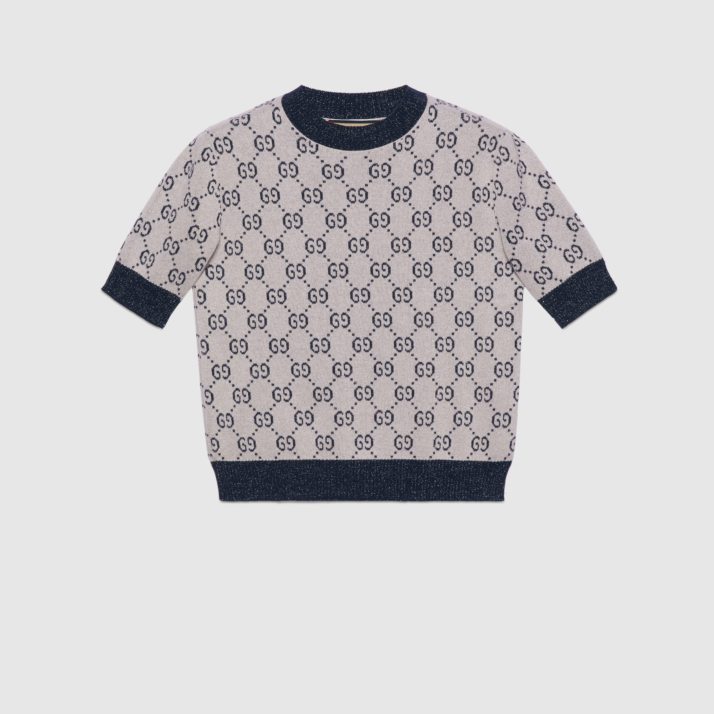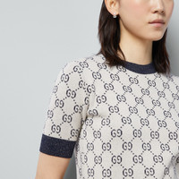 A strong logo feel is woven throughout the collection in an exploration of the possibility within versatility. A range of ready-to-wear pieces from the Gucci Love Parade collection embodies this theme through a quintessentially Gucci motif reworked in contemporary ways. This top features a lamé GG jacquard motif. - Ivory and blue GG lamé cotton jacquard - Rib knit trims - Crewneck - Short sleeves - Sleeve Length: 10,2" - Length: 21,2" based on a size S - Made in Italy - The model is 5'7" tall. The product shown in this image is a size small - Hem Width: 14,5"