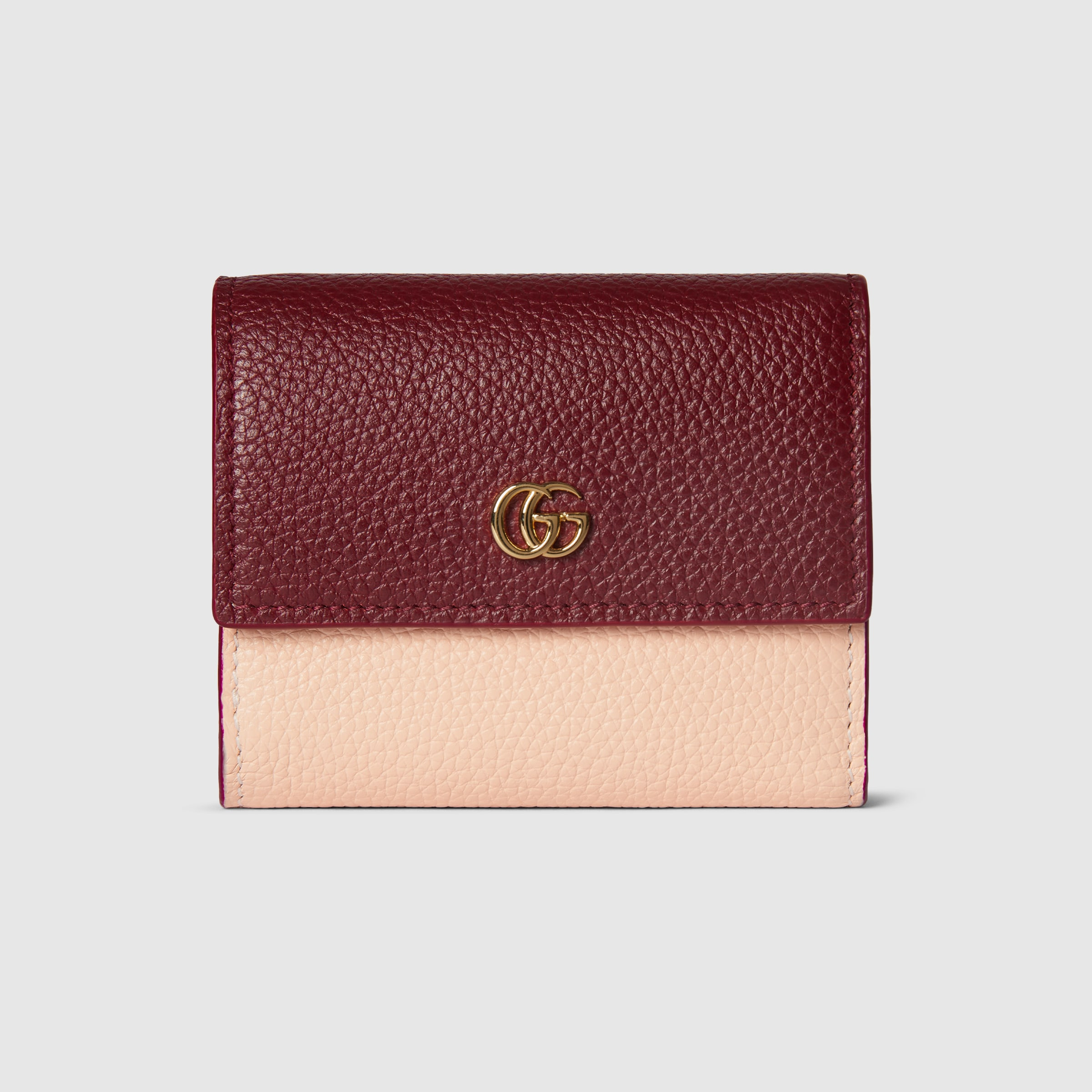 GG Marmont features colourful iterations, elevating signature silhouettes with new functions. This bi-color mini wallet is presented in Gucci Rosso Ancora red and pink leather enriched with the Double G detail. - Gucci Rosso Ancora red and pink leather - Gold-toned hardware - Double G - Inside: 2 card slots, 2 flat internal pockets, 1 bill compartment, 1 zip pocket - Outside: 1 flat back pocket - Button closure - Closed: W3.9" x H3.1" x D0.6"; Open: W8.3" x H3.9" - Weight: 0.41lbs approximately - Made in Italy