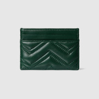 The GG Marmont introduces versatile silhouettes in a fresh palette, such as this card case in green matelasse chevron leather, complete with the Double G hardware in a light gold-toned finish. - Green matelasse chevron nappa leather - Light gold-toned hardware - Tonal fabric lining - Double G - Inside: 4 card slots, 1 open compartment - 4"W x 2.5"H - Weight: 0.14lbs approximately - Made in Italy