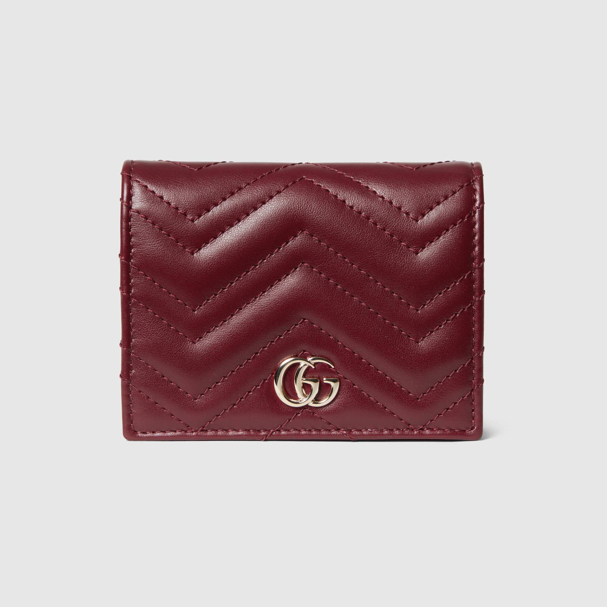This GG Marmont foldable card case is crafted from the new Gucci Rosso Ancora red matelassé chevron leather. The signature Double G hardware in a lighter gold-toned defines this accessory, complete with five card slots. - Gucci Rosso Ancora red matelassé chevron leather - Light gold-toned hardware - Moiré lining - Double G - Five card slots - One bill compartment - One zip pocket - Interior open pocket - Snap closure - Closed: 4.5"W x 3.5"H x 1"D - Open: 4.5”W x 7”H - Made in Italy