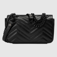 The mini GG Marmont chain shoulder bag has a softly structured shape and an oversized flap closure with Double G hardware. The sliding chain strap can be worn multiple ways, changing between a shoulder and a top handle bag. Made in matelassé chevron leather, the accessory is introduced for Gucci Love Parade with monochrome hardware. - Black matelassé chevron leather - Black brass hardware with ceramic effect finishing - Double G - Sliding chain strap can be worn as a shoulder strap with 55cm drop or can be worn as a top handle with 30cm drop. Can also be worn cross body. - Flap with spring closure - Weight: .6kg approximately - Mini size: 8.5"W x 5"H x 2.5"D - Made in Italy - Fits up to: iPhone Pro Max/Plus, Airpods, small wallet, and lipstick