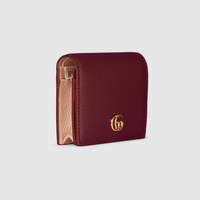 This GG Marmont mini wallet is crafted from leather in Gucci Rosso Ancora red, contrasted with pink accents for a playful finish. The structured design features the signature Double G hardware in gold-tone. - Gucci Rosso Ancora red and pink leather - Gold-toned hardware - White taffeta lining - Double G - Five card slots, one open pocket - One bill compartment - Interior zipper pocket - Snap closure - Weight: 0.25lbs approximately - Open: 4.3" W x 6.9" H - Closed: 4.3" W x 3.3" H x 1.2" D - Made in Italy
