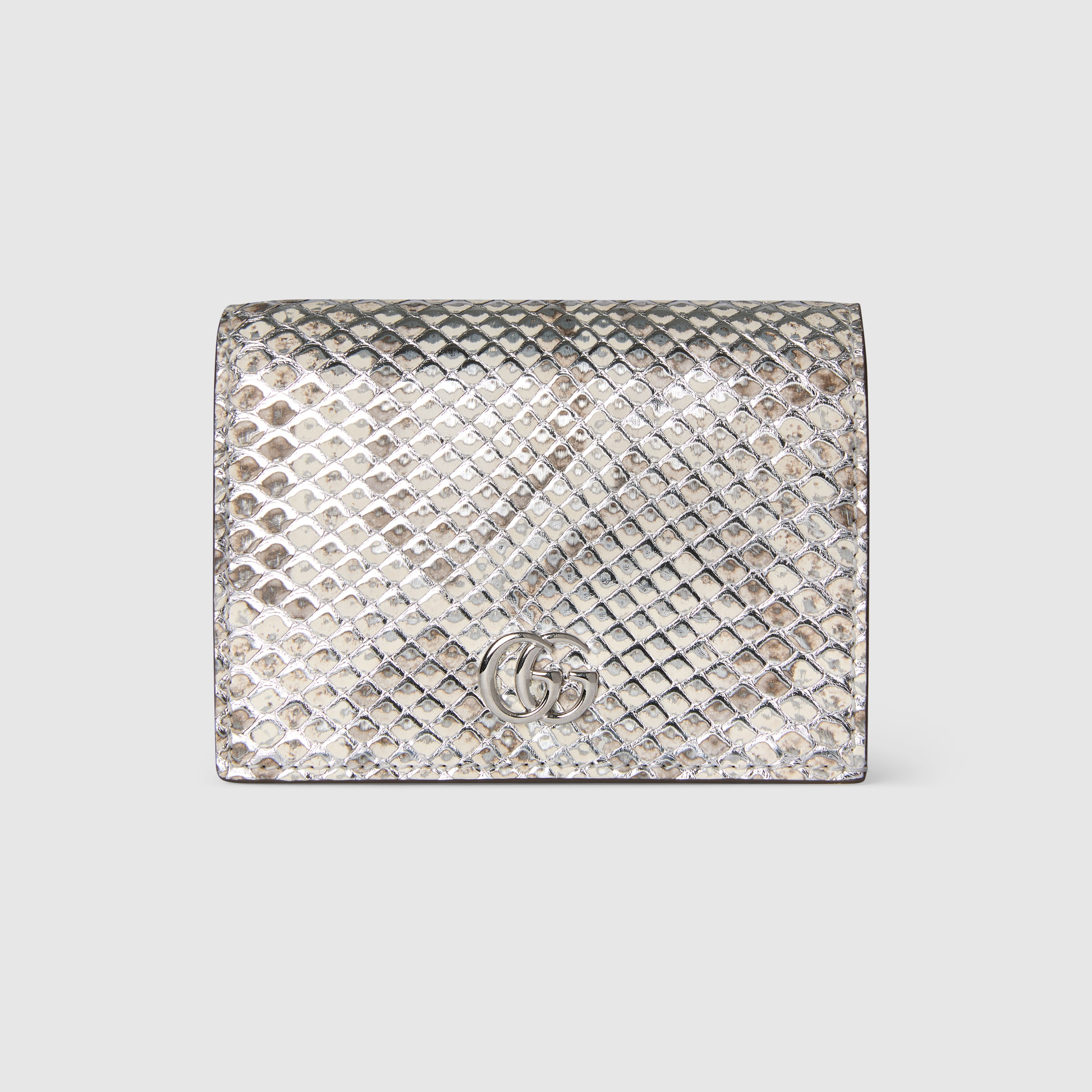 The GG Marmont collection introduces metallic styles for the gifting season. Shiny leather transitions from day to evening, complemented by the Double G hardware, such as this laminated-effect python wallet. - Metallic light silver laminated-effect python leather - Silver-toned hardware - Grey taffeta lining - Double G - Five card slots, one open pocket - One bill compartment - Interior zipper pocket - Snap closure - Weight: 0.25lbs approximately - Open: 4.3" W x 6.9" H - Closed: 4.3" W x 3.3" H x 1.2" D - Made in Italy