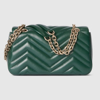 The GG Marmont, a signature collection of the House, features the Double G hardware, a faceted chain strap, and soft construction in an exceptionally supple leather. - Green matelasse chevron nappa leather - Light gold-toned hardware - Green viscose lining - Double G - Inside: 1 open pocket - Sliding chain strap can be worn as a shoulder strap with 21.7" drop - Flap with spring closure - 8.7" x 4.9"H x 2.4" - Weight: 1.2lbs approximately - Made in Italy - Fits iPhone Pro Max/Plus, Airpods, long wallet, and lipstick