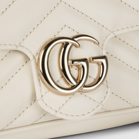 The Double G hardware brings the past into the House's present with the notion that a cherished wardrobe is enriched by items that can be worn season after season. This bag with a chain strap is crafted from the signature matelasse chevron leather in white, while the inside features a contrasting black leather card case that can be detached. - White matelasse chevron leather - Additional card case in black leather - Antique gold-toned hardware - Moire and microfiber lining with suede-like finish - Double G - Inside: 2 card slots, detachable card case with zip closure - Outside: 1 back pocket - Chain strap drop: 21.6" - Magnetic snap button closure - 8.3"W x 4.7"H x 2"D - Weight: 1lbs approximately - Made in Italy - The model is 5'9" tall - Fits up to iPhone Pro Max/Plus, Airpods, card case, and lipstick