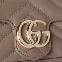 Embellished with the archival Double G logo, first introduced in the 1970s, the GG Marmont line has established itself as a signature style of the House. The two capital letters refer to the historic emblem, recognizable by the partially overlapping hardware on this bag front. Crafted from taupe matelasse leather, the elegant small accessory is evocative of Florentine craftsmanship. - Taupe matelasse chevron leather - Light gold-toned hardware - Microfiber lining with suede-like finish - Attached key ring that can attach to a separate bag - Double G - Chain shoulder strap with 23.6" drop - Weight: 12.4 oz approximately - Super mini size: 6.2"W x 4"H x 1.7"D - Made in Italy - The model is 5'9" tall - Fits up to iPhone Pro Max/Plus, Airpods, card case, and lipstick