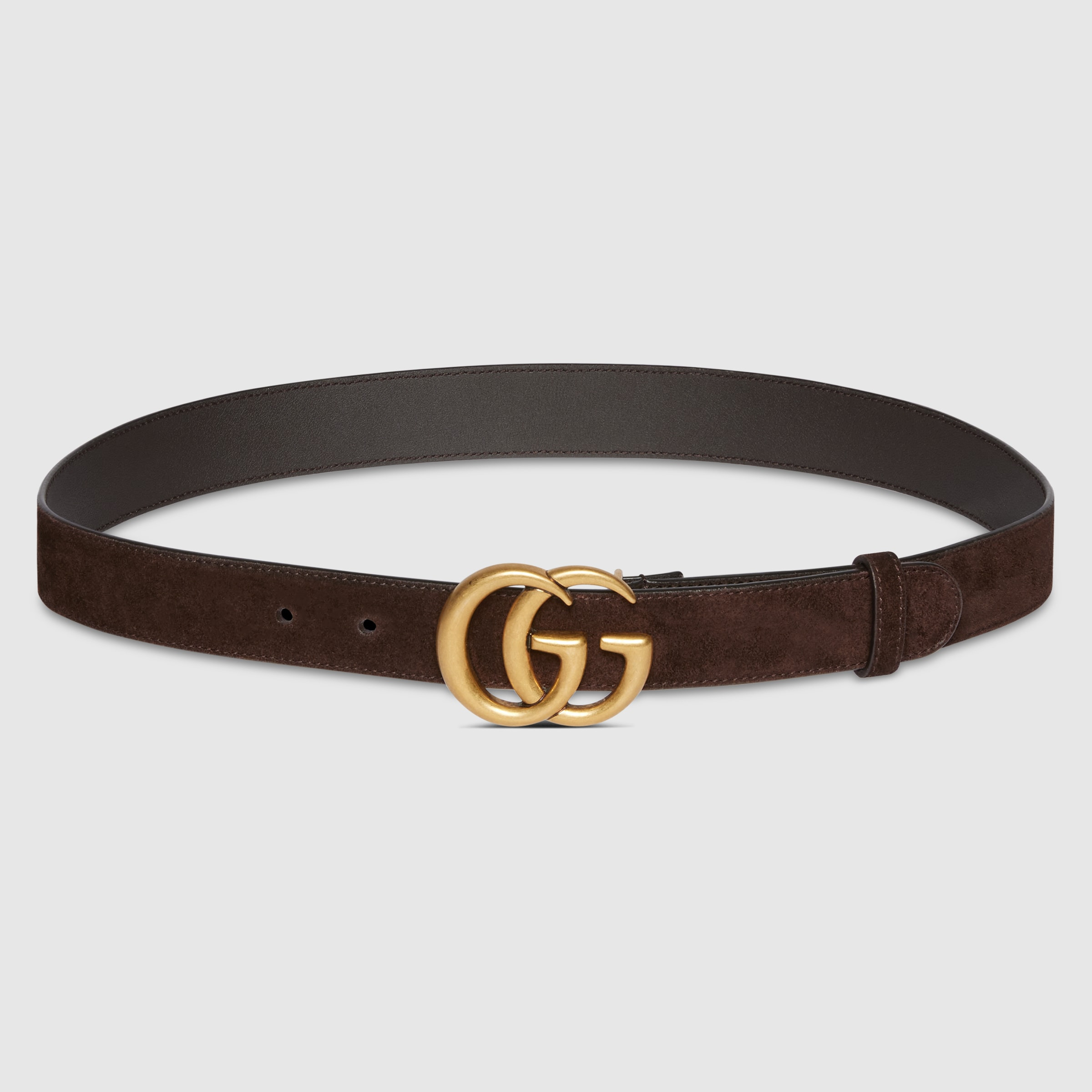 GG Marmont belts in soft suede have a sophisticated texture, and can be complemented by shoes crafted in the same material for a coordinated look. This thin belt is presented in a lightweight soft suede and defined by a Double G buckle. - Dark brown lightweight soft suede - Gold-toned hardware - Double G buckle - Buckle: 2.4"W x 2"H - 1" belt width - Made in Italy - Can be worn as a hip or waist belt. Sizing will differ based on where the belt is worn, please refer to the size guide to find your size.