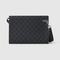 Slim and compact small leather goods from the latest collections highlight new colorful shades sporting the GG logo with a bicolor design. This pouch with six card slots appears in a black GG Supreme canvas, complete with a smooth grey leather trim. - Black GG Supreme canvas - Grey leather trim - Brass hardware with dark grey ceramic-effect finishing - Cotton linen moiré lining - GG detail - Inside: 6 card slots - Detachable wrist strap - Zip closure - 10.2"W x 7"H x 2.4"D - Made in Italy - Weight: 0.85lbs approximately