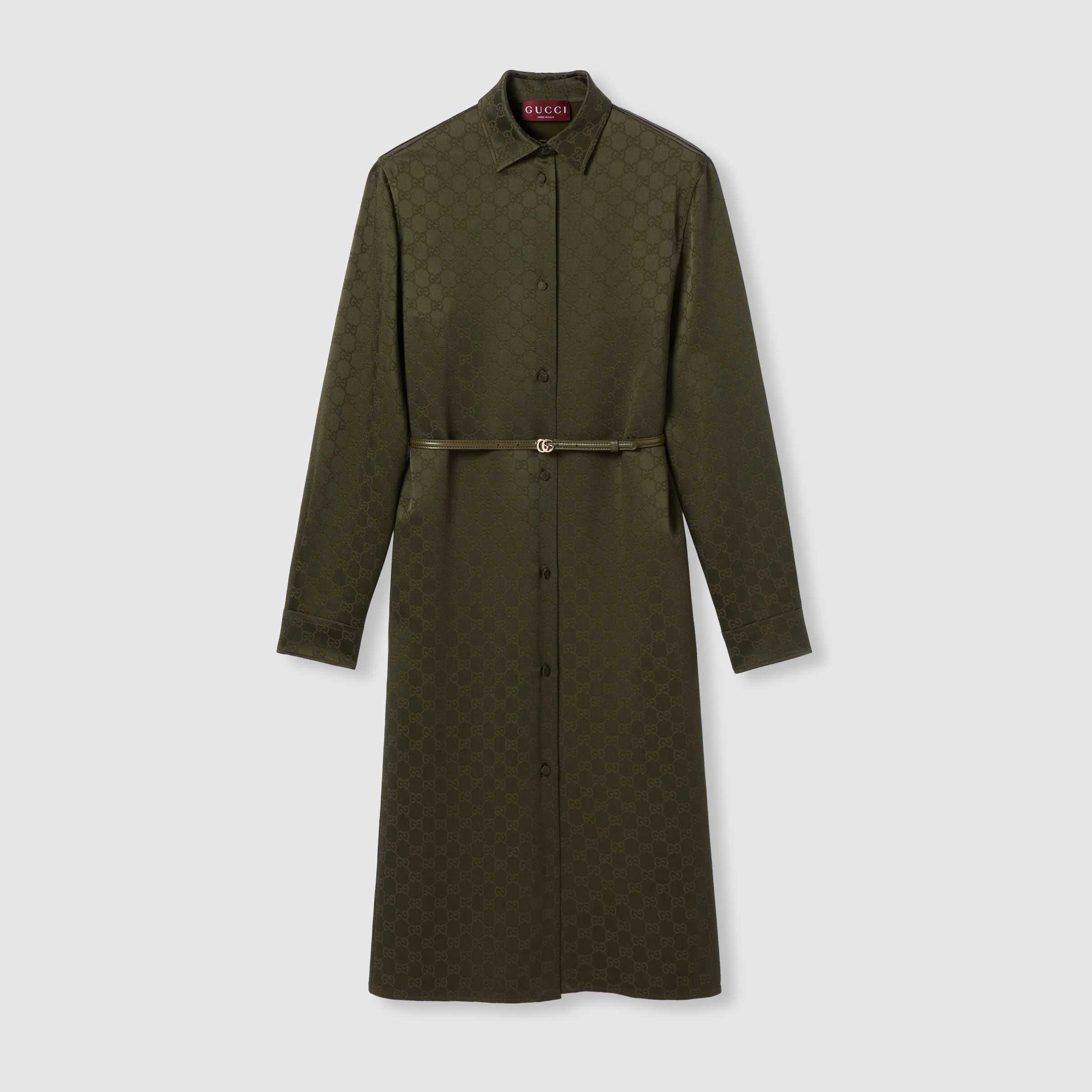 Green defines the color narrative for Pre-Fall 2025 and speaks volume with textures, logo details and varying tonalities, as seen on the runway. This shirt dress in the distinctive hue, appears in GG satin and is complete with a leather Double G belt. - Forest green GG satin - Self-covered buttons - Unlined - Point collar - Long sleeves - Detachable leather belt with Double G buckle - Button closure - Made in Italy
