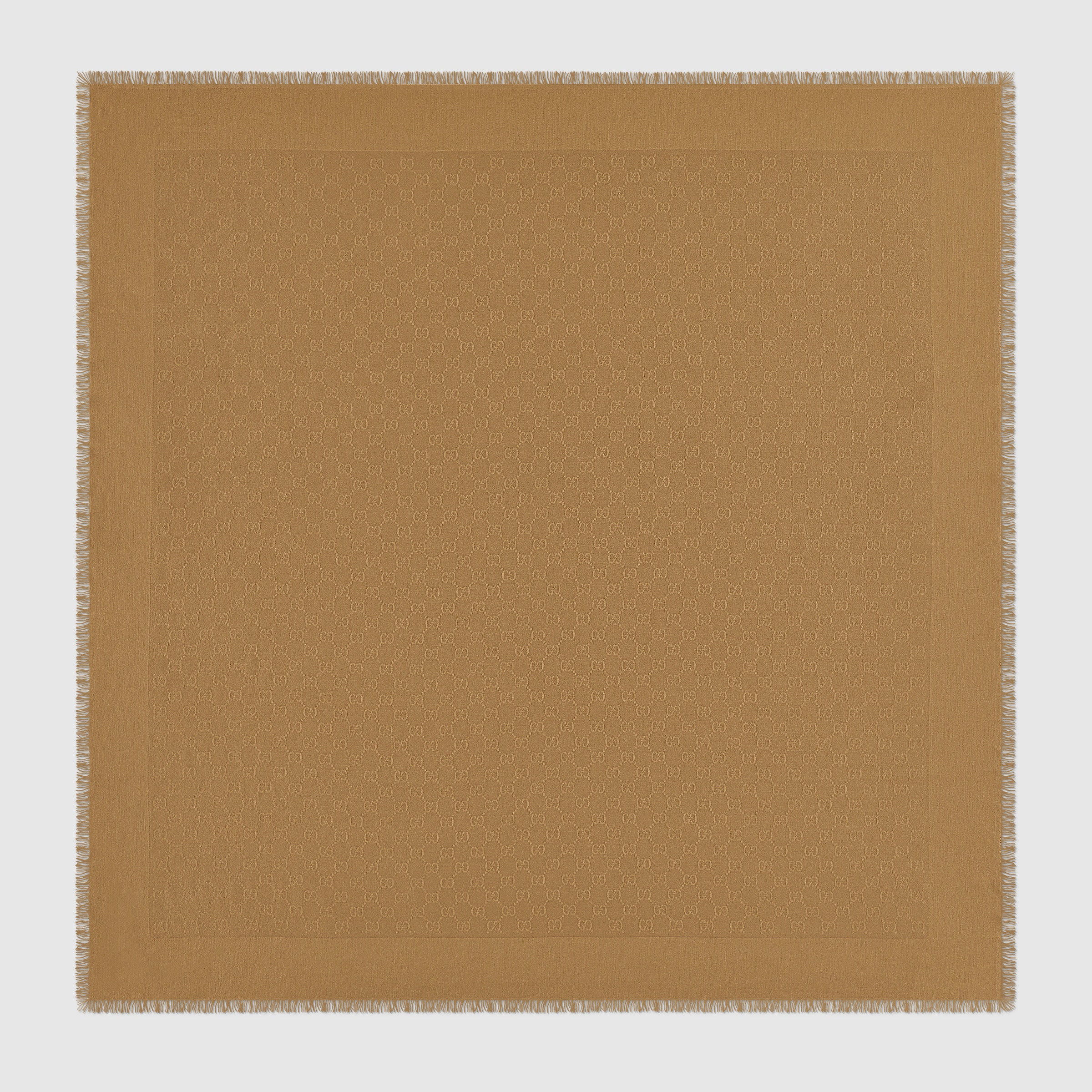 The Pre-Fall 2025 collection presents the GG motif across a wide selection of silk accessories that can be layered. Crafted from a GG cotton silk jacquard, this soft shawl is completed with a fringe trim. - Beige GG cotton silk jacquard - Fringe trim - 49.2"W x 49.2"L - Made in Italy