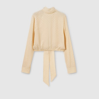 In the Fall Winter 2025 collection, this long-sleeved top is designed with a self-tie neck bow. The style is completed by a Gucci metal detail, covered button closure and buttoned cuffs. - Light beige GG silk jacquard - Unlined - Self-tie neck bow - Ruched elastic waist with metal Gucci buckle - Long sleeves with buttoned cuffs - Covered button closure - Length: 18.3"; based on a size 38 (IT) - Made in Italy