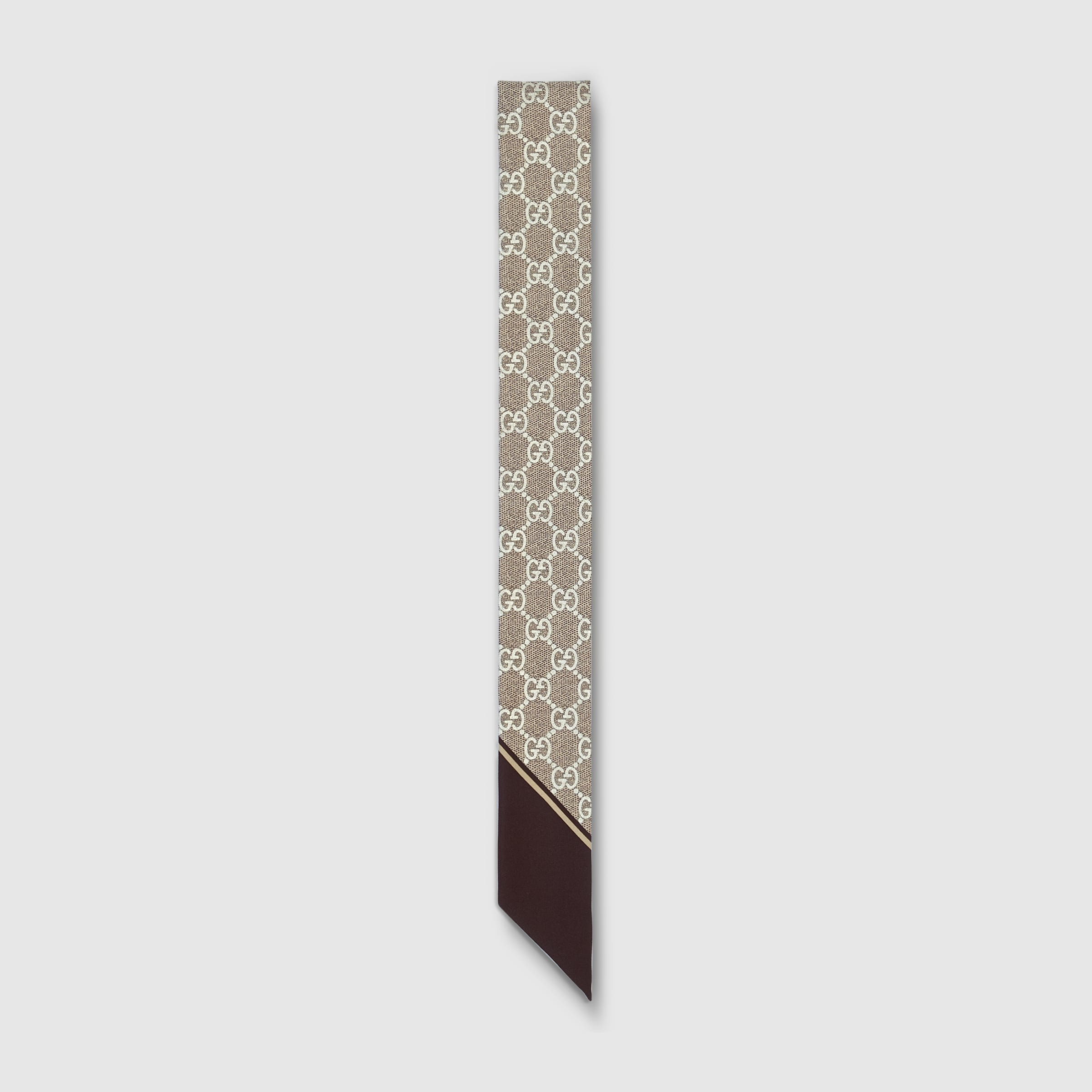 A signature symbol of the House, the GG monogram is displayed atop a selection of silk accessories in a delicate color palette. Crafted from camel silk, this neck bow is decorated with a laminated GG motif. - Camel silk - Lame GG print - Dark brown trim - 2"W x 47.3"L - Made in Italy