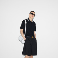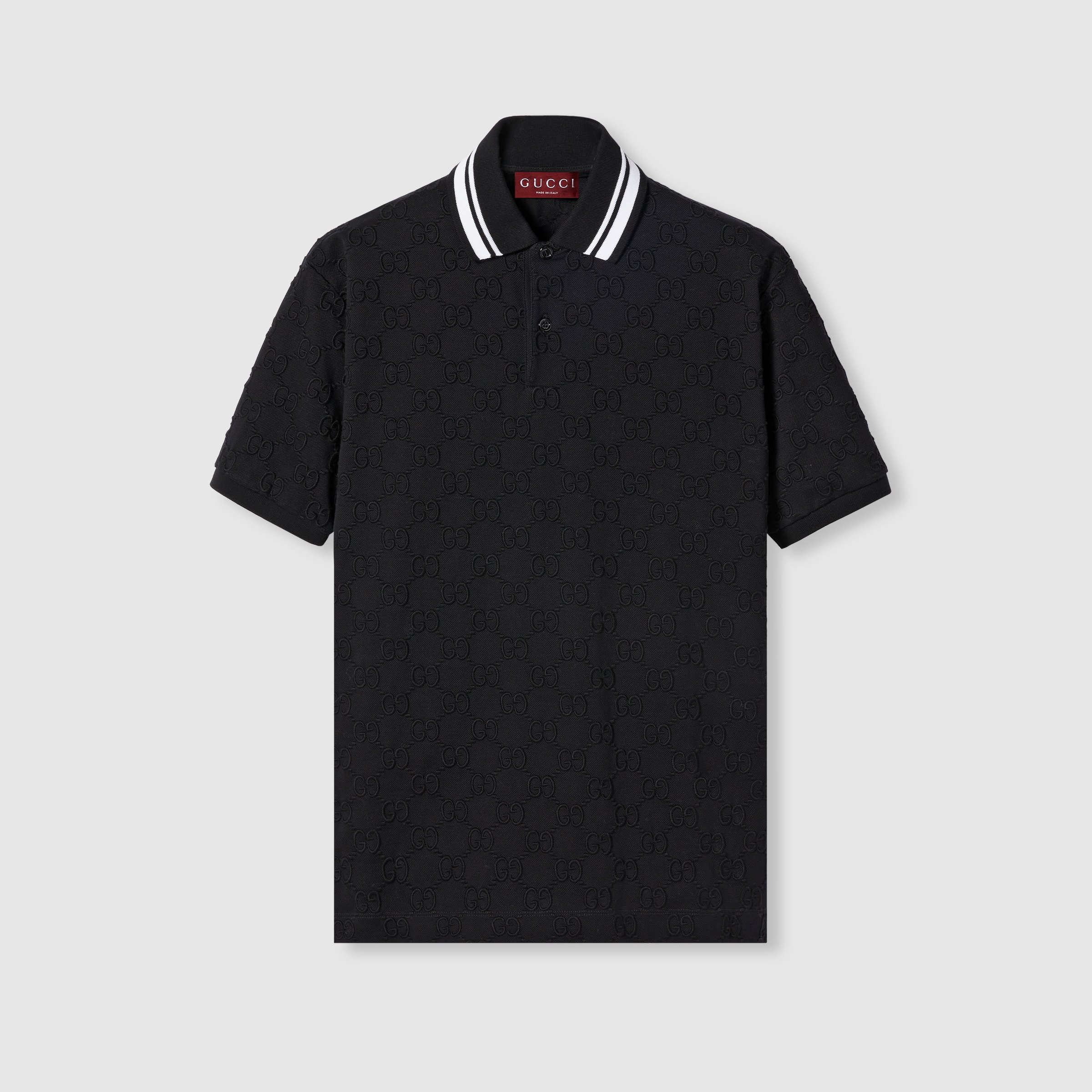 The Pre-Fall 2024 collection presents contemporary style with a twist. A black allover GG defines this polo—bringing a surprising and refined take on its stretch cotton piquet construction. The piece is accentuated by black and white striped collar. - Black and multicolor GG stretch cotton - Black and white striped collar - GG embroidery - Short sleeves - Shoulder drop: 18.1"; based on a size S - Chest: 21.6"; based on a size S - Sleeves length: 9.2"; based on a size S - Button-through placket - Regular fit - Length: 28.9"; based on a size S - Made in Italy - The model is 6' and is wearing size small - Fabric: 94% Cotton, 6% Elastane - Trimming: 100% Cotton - Embroidery: 89% Cotton, 11% Polyester