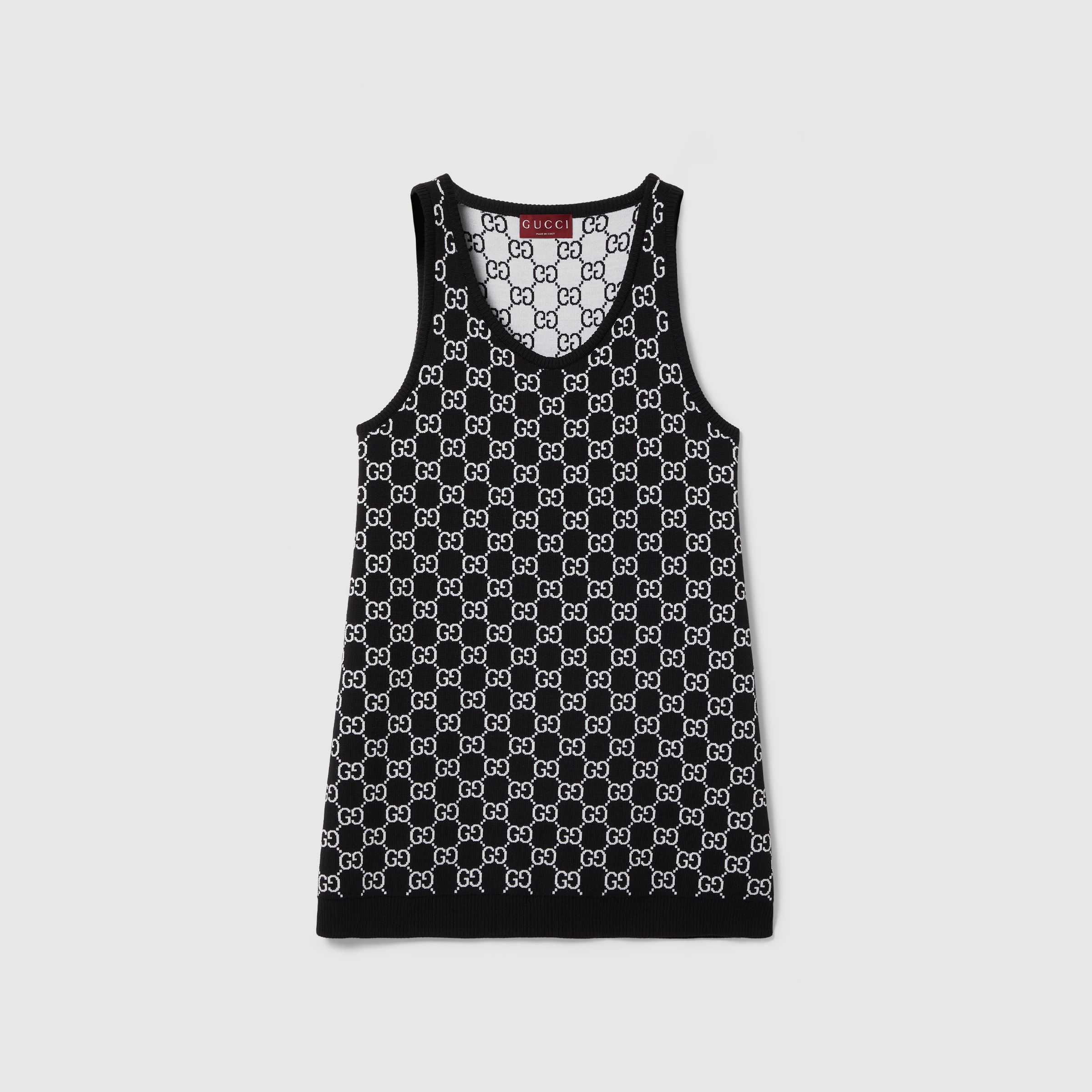 Taking inspiration from founder Guccio Gucci's monogram, the GG motif continues to be a firm favorite of the House. This mini dress is presented in a fine wool tubular GG jacquard stitch and completed with a contrasting rib trim. - Black and white reversible fine wool tubular GG jacquard stitch - Scoop neck - Sleeveless - Rib trim - Shoulder drop: 11.2 " based on a size XS (IT) - Mini - Length: 32.7"; Shoulder: 11.8" based on a size s - Made in Italy - The model is 5'9" and is wearing size extra small