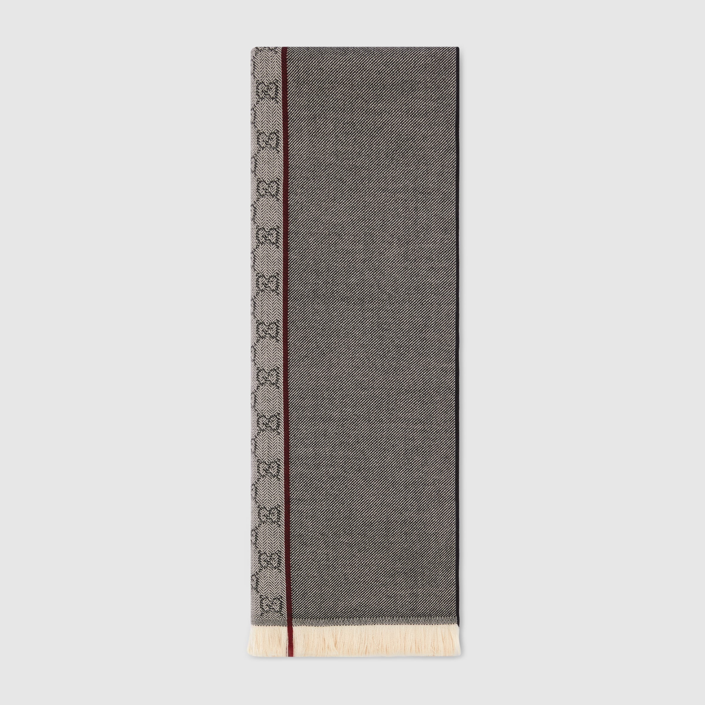 The Cruise 2026 men's soft accessories collection is a journey through legacy and modernity rooted in Gucci's archives. This soft scarf has been made from a GG wool jacquard and completed with a fringe trim. - Grey and black GG wool jacquard - Fringe trim - 18.5"W x 72.04"L