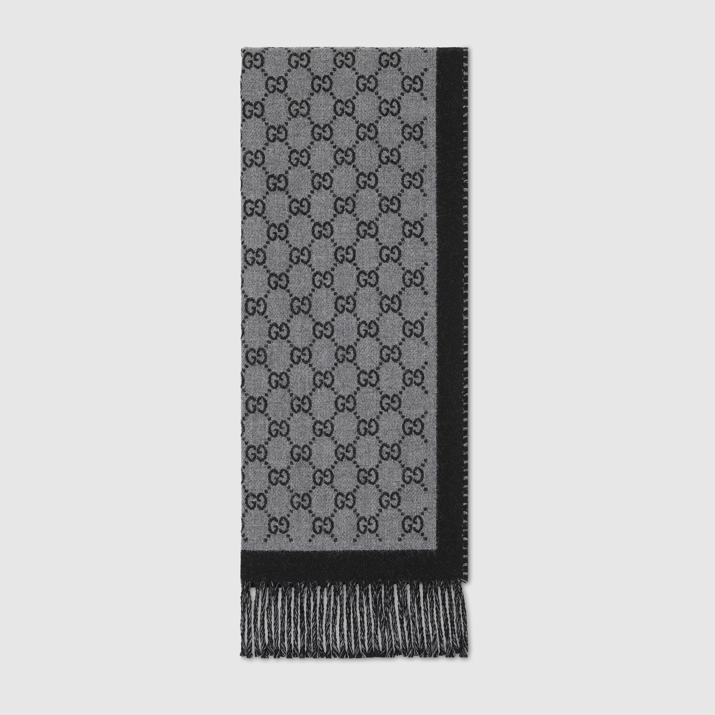 The Pre-Fall 2025 silk accessories collection animates House codes through sophisticated trimmings, logo patches and subtle embroideries. This scarf is presented in a GG wool jacquard with a fringe trim. - Black and grey GG wool jacquard - Fringe trim - 13.3"W x 76.3"L - Made in Italy