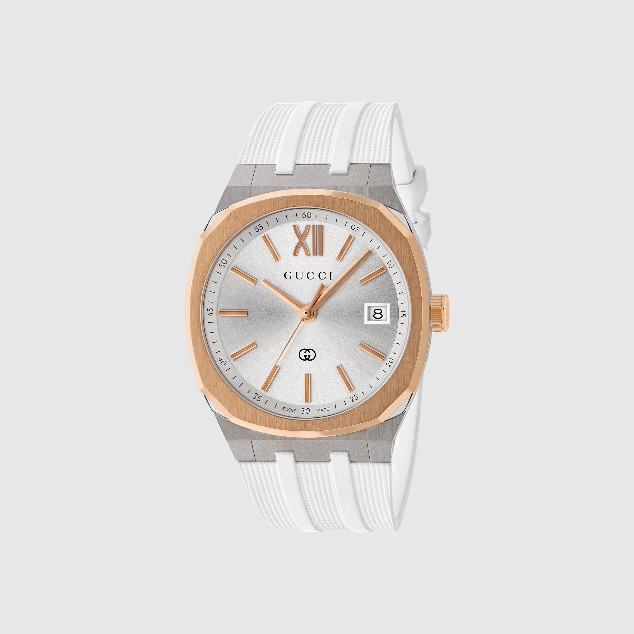The latest GUCCI 25H collection showcases a streamlined silhouette, featuring refined elements that enhance the watch's sleek design. Powered by a quartz movement, the accessory is defined by a white rubber interchangeable strap and a stainless steel case with silver dial. - 36mm stainless steel multi layered case - Pink gold-plated bezel, silver dial, Interlocking G detail, Gucci logo and date opening - Sapphire glass with antireflective coating - White rubber interchangeable strap - The warranty certificates for Gucci watches purchased after March 1st 2022 are exclusively available online. - Download your certificate at - by using the serial number engraved on the back of your watch. - Quartz movement - 5 ATM (50 meters/164 feet) - YA163439 - Wrist size from 5.5" to 7.2"